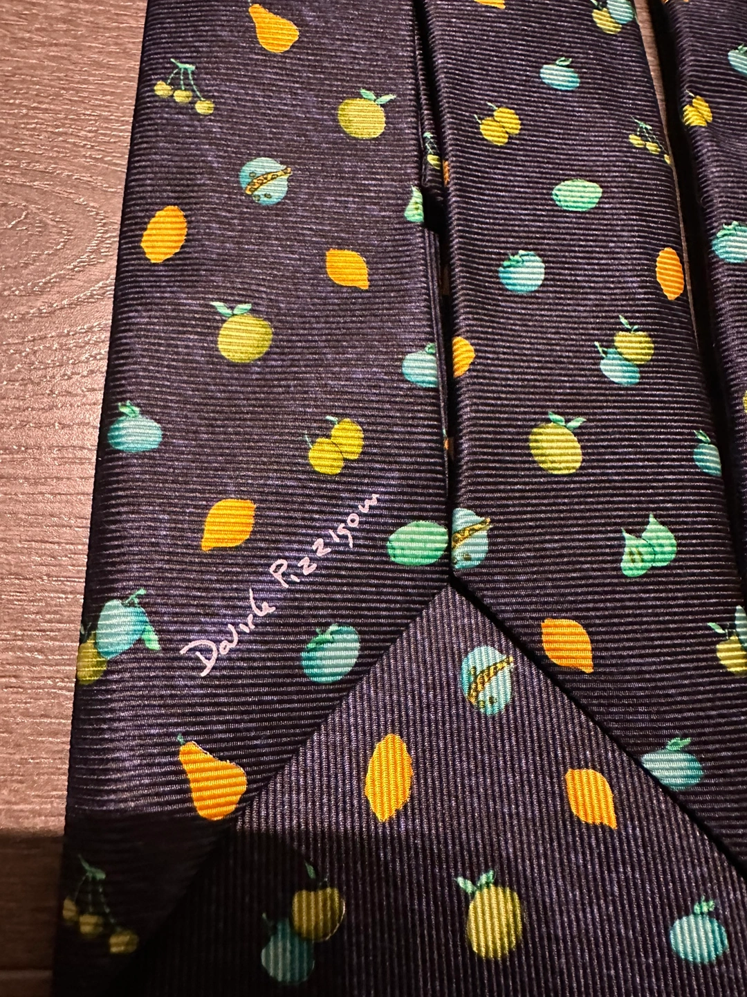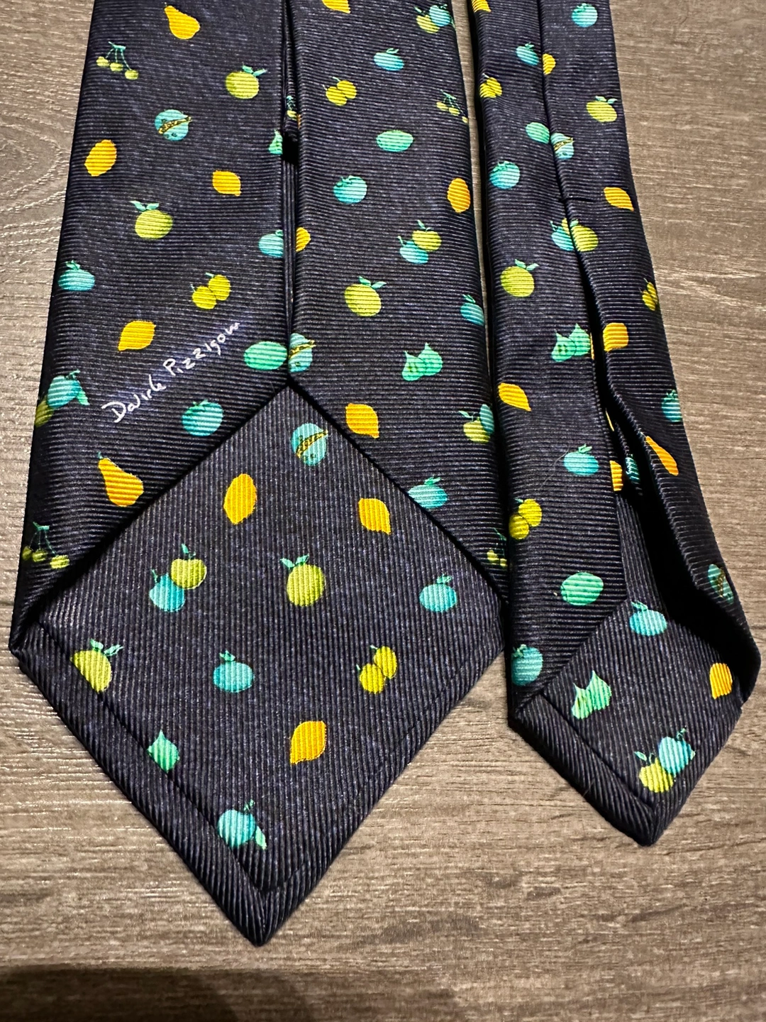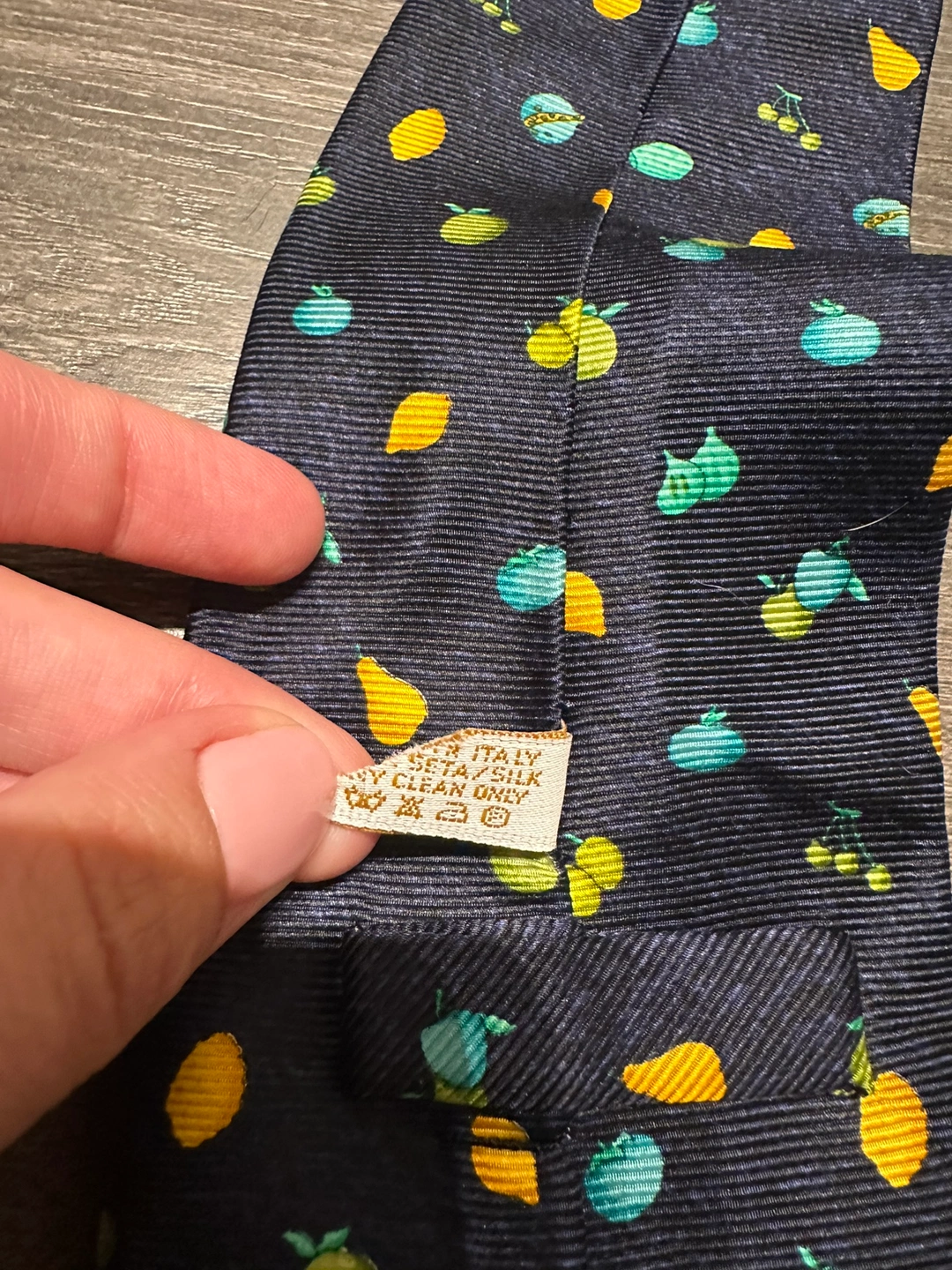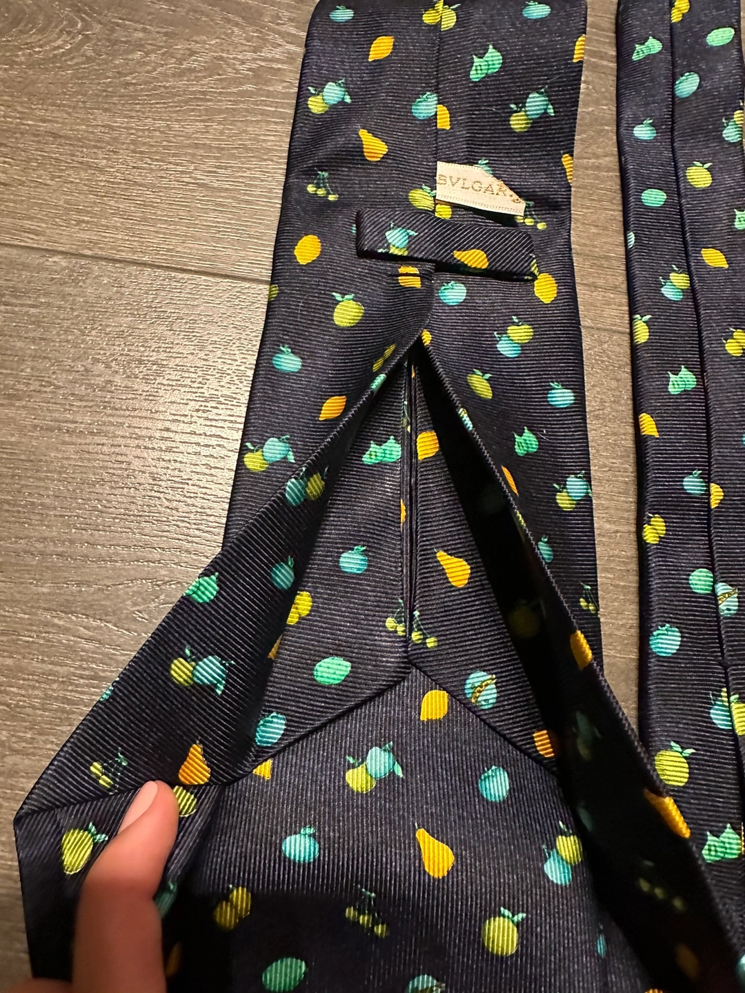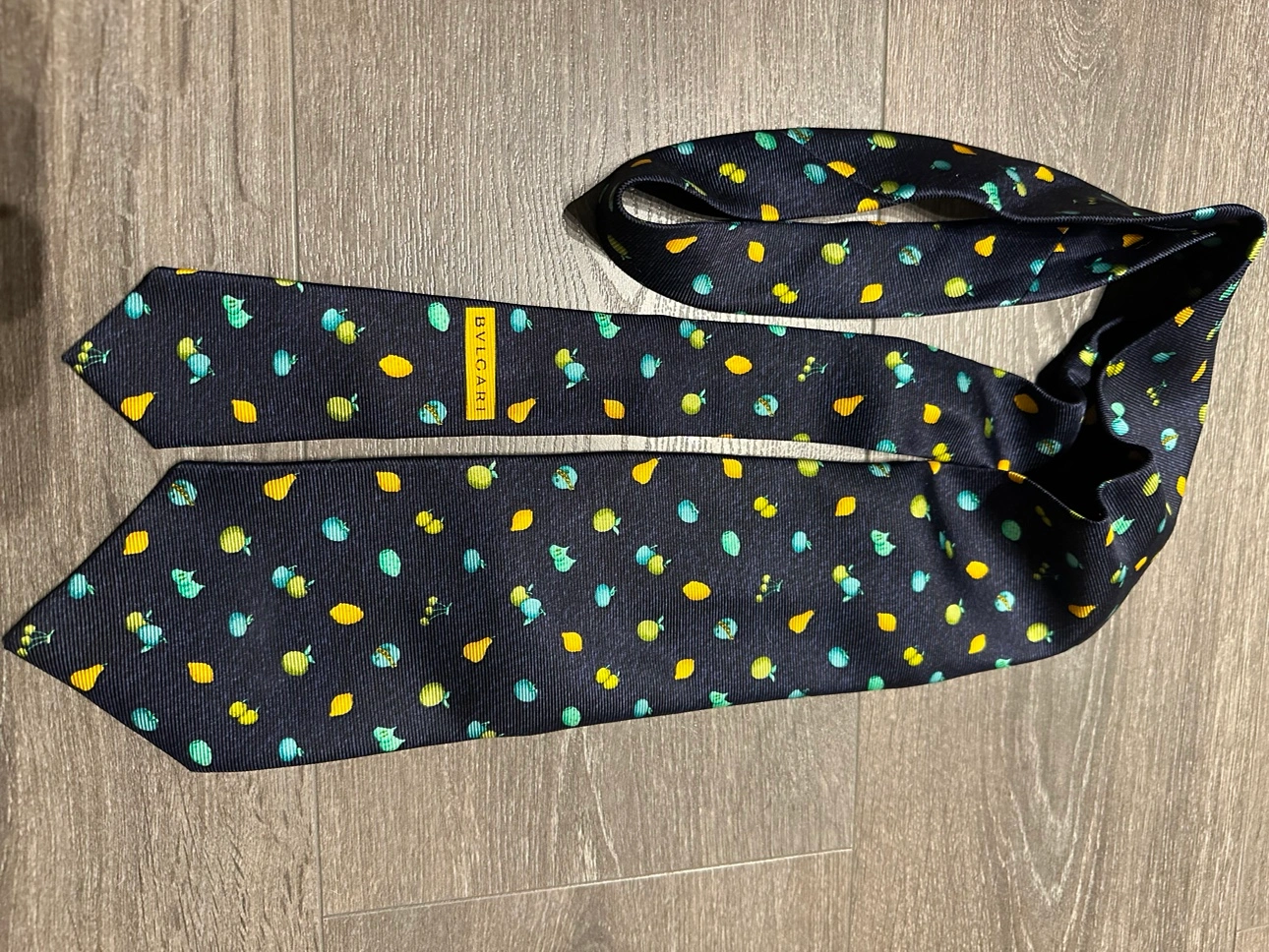 100% authentic Bulgari silk tie A navy blue silk tie with a pattern of lemons, pears, cherries, and figs. Great condition Imperfection on the inner label shown in photos
