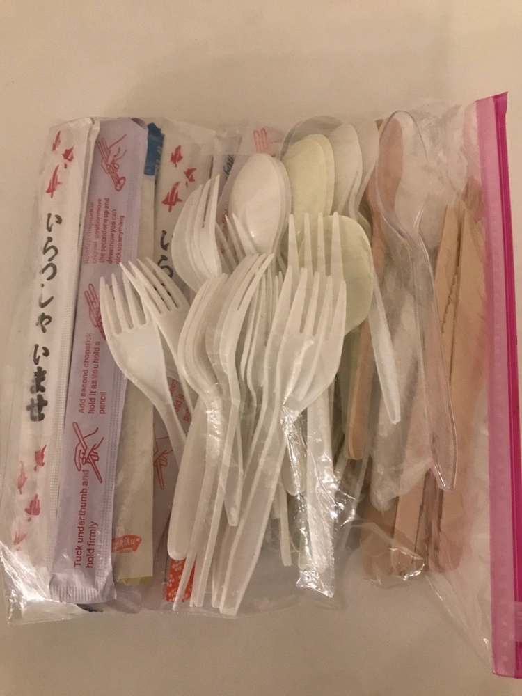 A variety of plastic spoons, forks, chopsticks (20+) and wooden knives. **All unused and didn’t have heart to toss to landfill