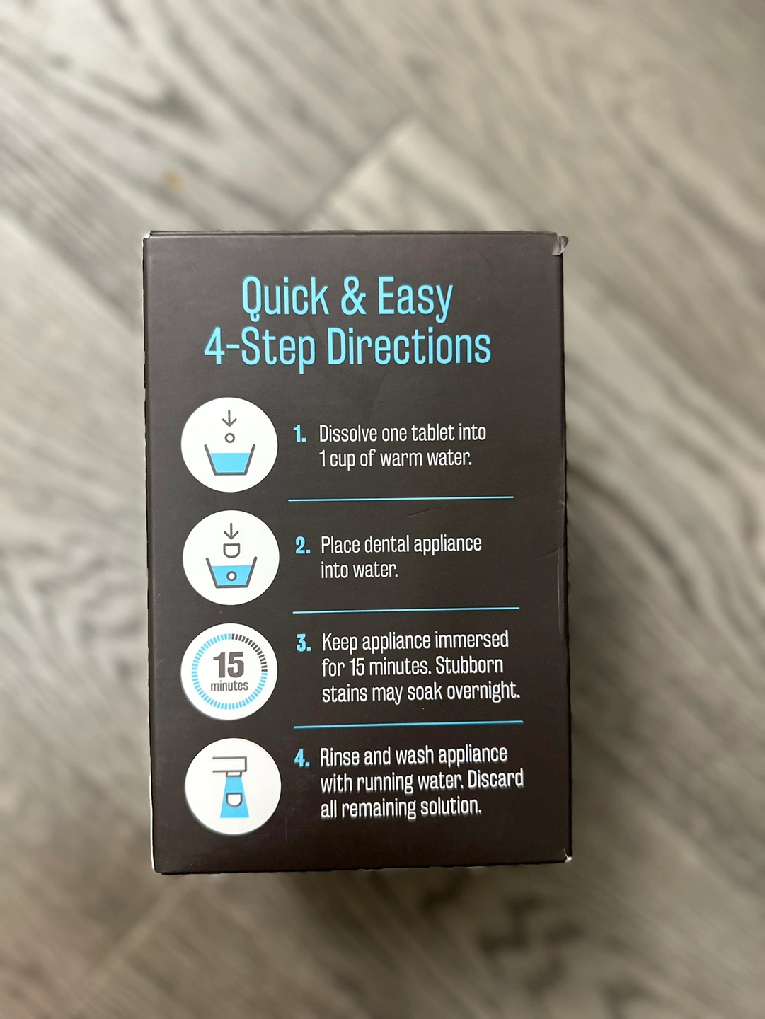 120 tablets in a mint flavour. 4 month supply. Kills 99% of bacteria and removes stains. For aligners, retainers, dentures and night guards. I used 8. There are 112 tablets left in the box.