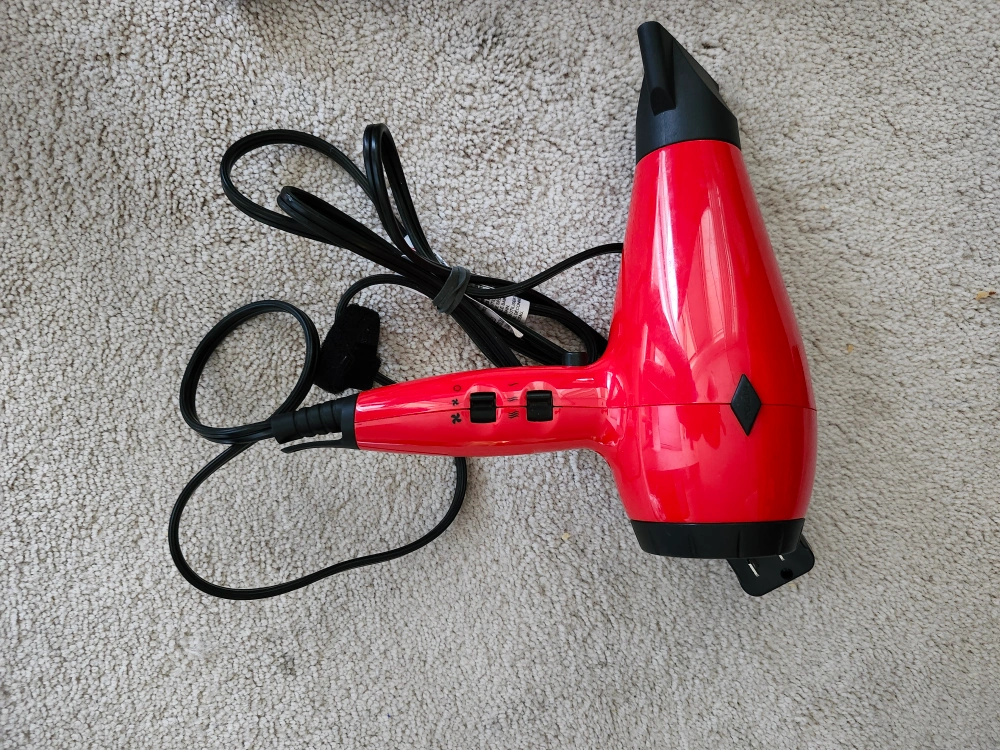 This is a red hair dryer with a black cord and handle. It has different heat settings, including a cool setting.