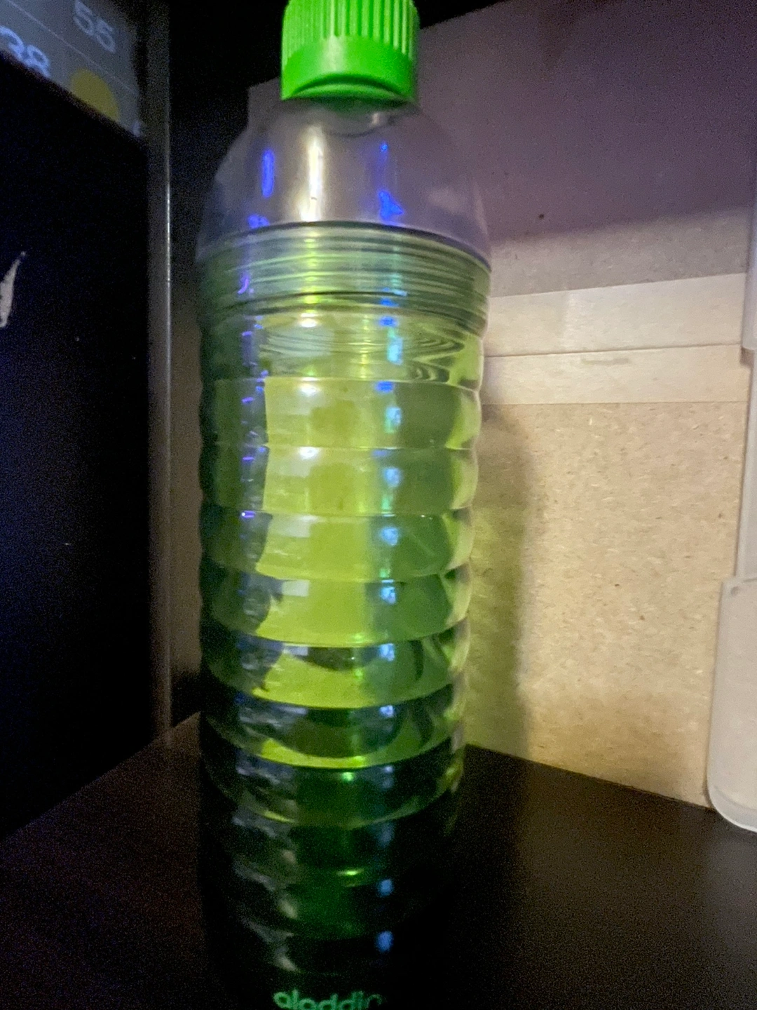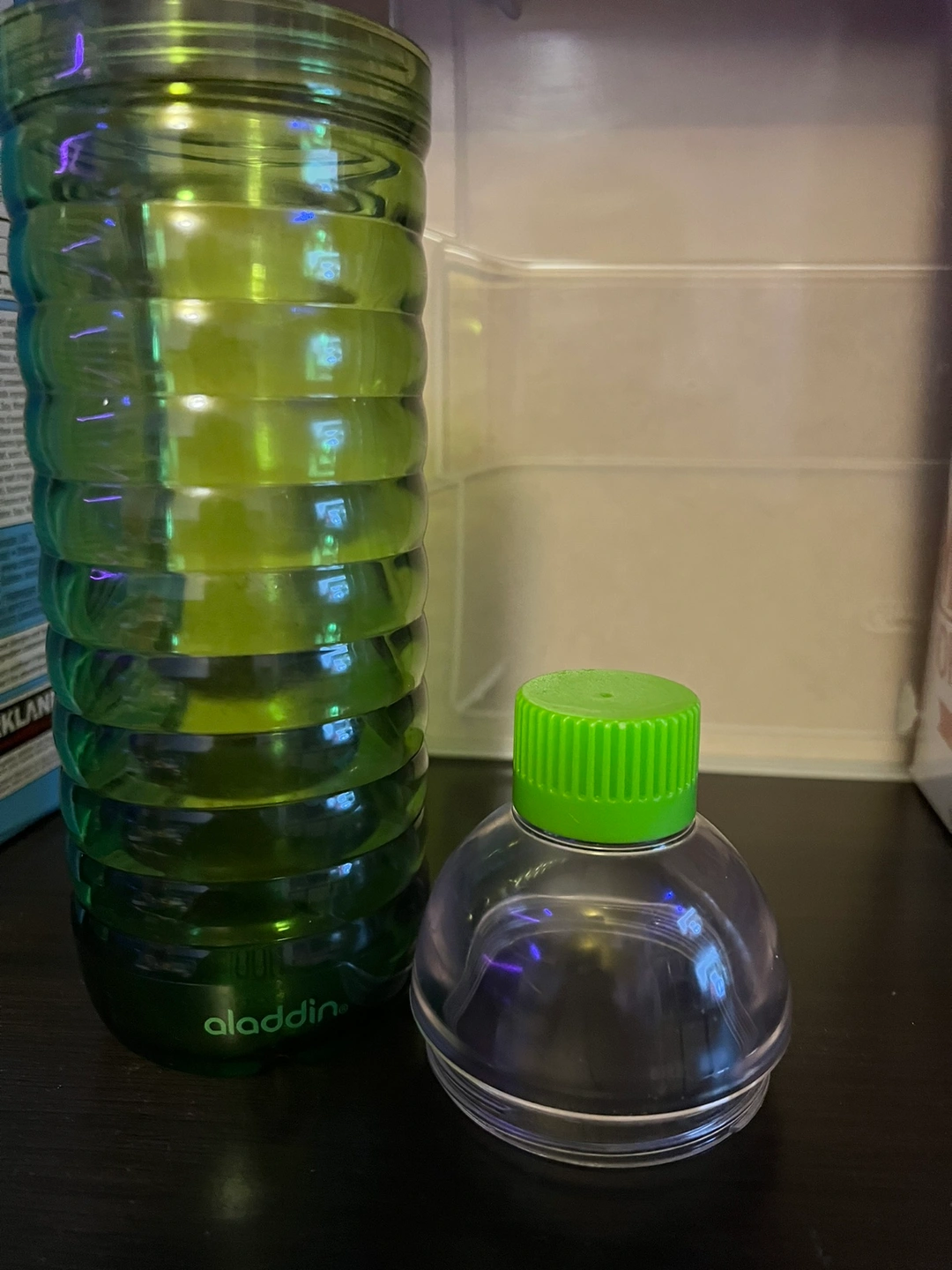 Green water bottle with a green lid and a clear body. It is approximately 20 oz. The bottle has an interesting textured design. It has the Aladdin logo on the bottom. It comes with a separate, smaller, clear bottle with a green lid that is also textured. This smaller bottle could be for infusing water with fruit, for example.