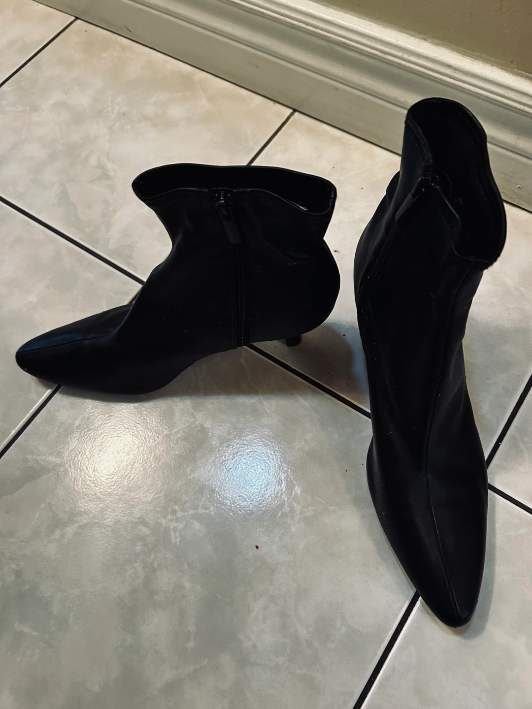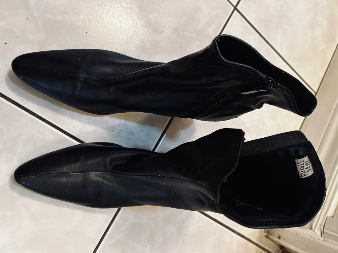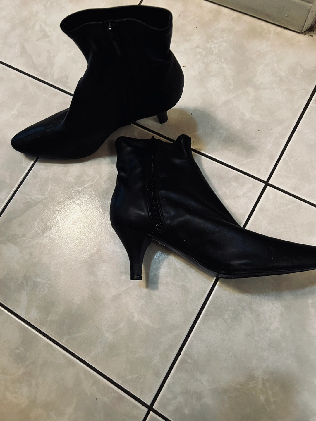 Black ankle boots with a low heel and a pointed toe. They have a zipper on the inside of each boot. They are in good condition.