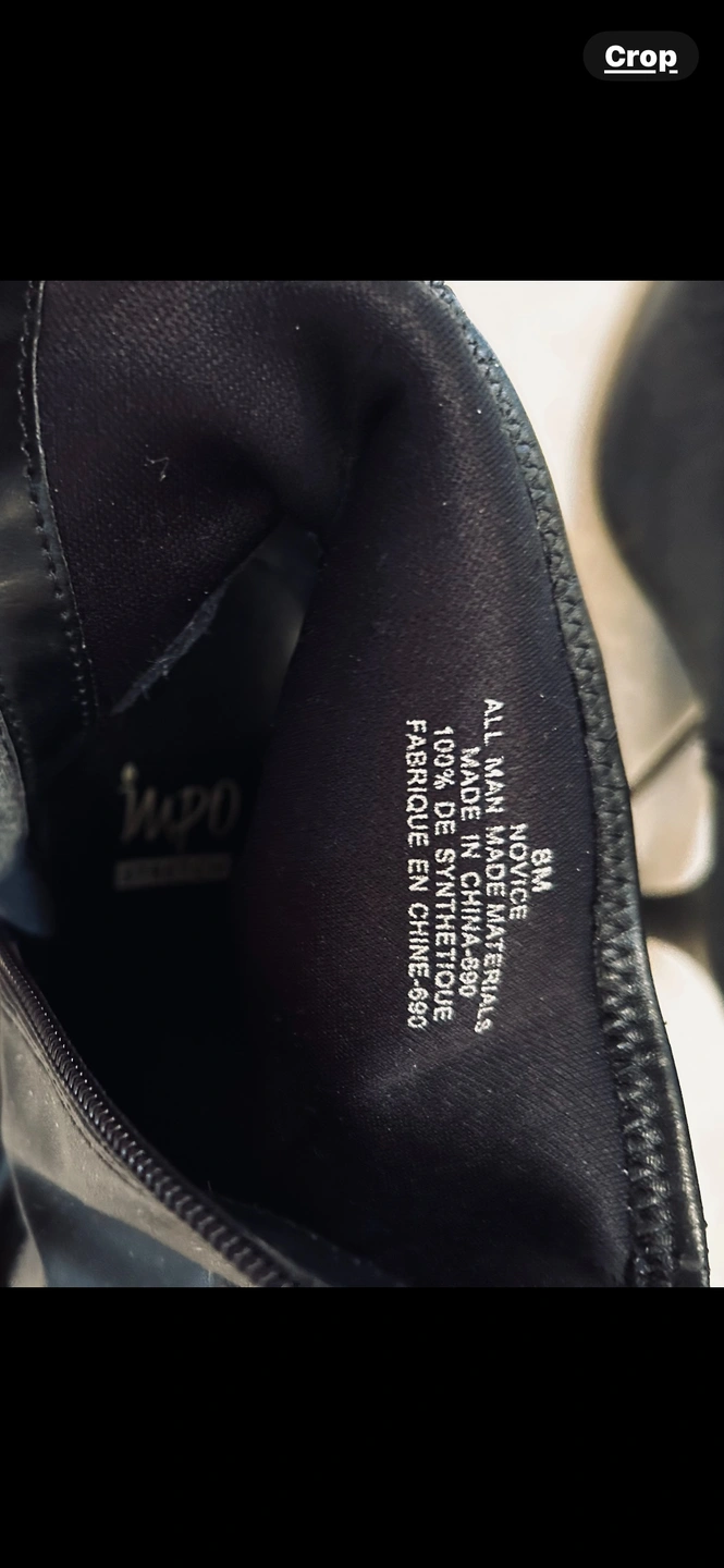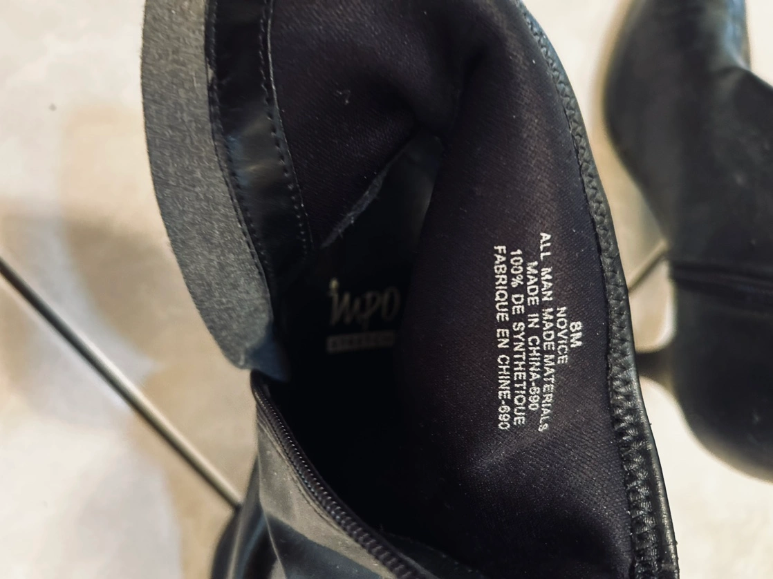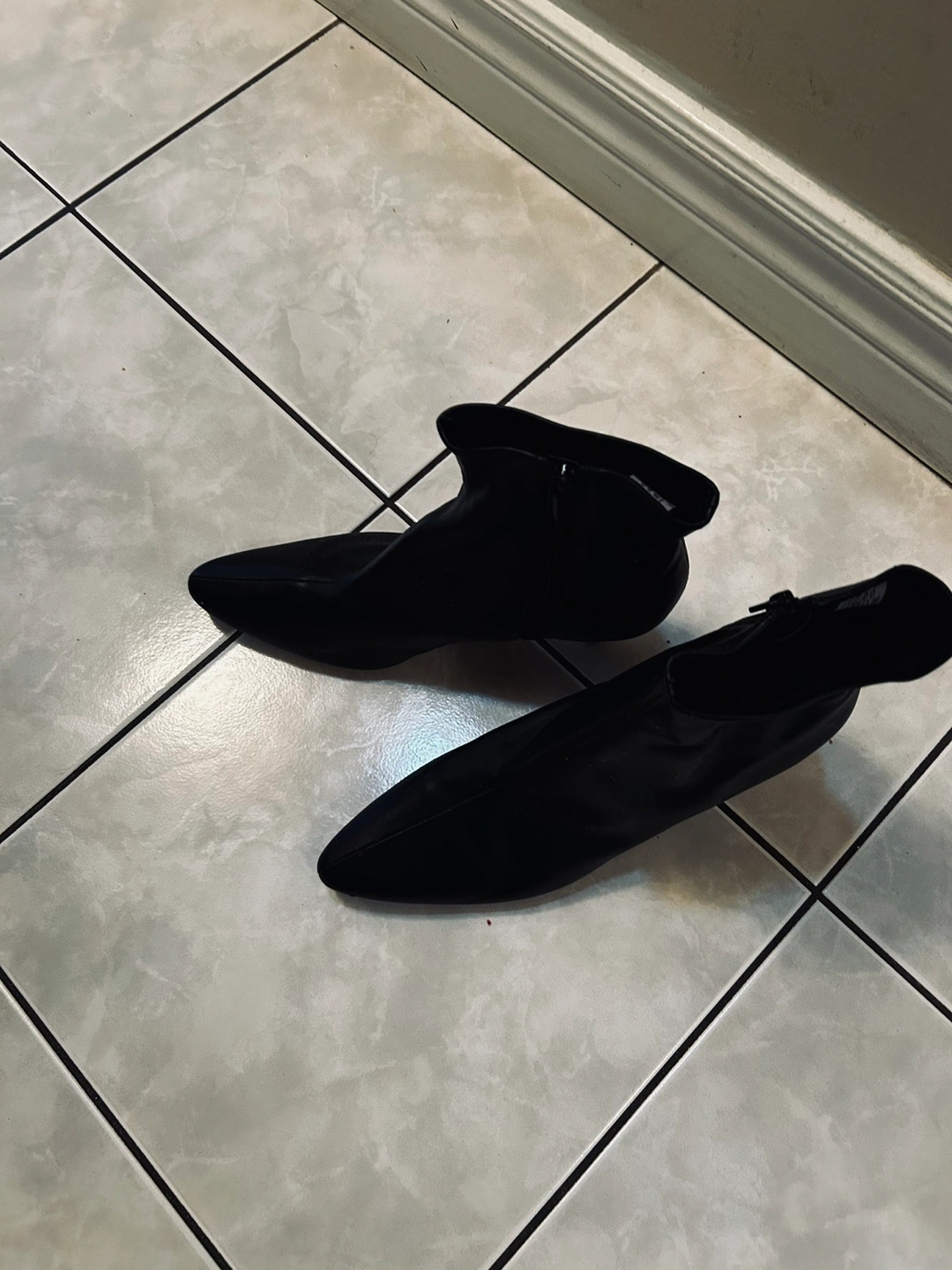 Black ankle boots with a low heel and a pointed toe. They have a zipper on the inside of each boot. They are in good condition.