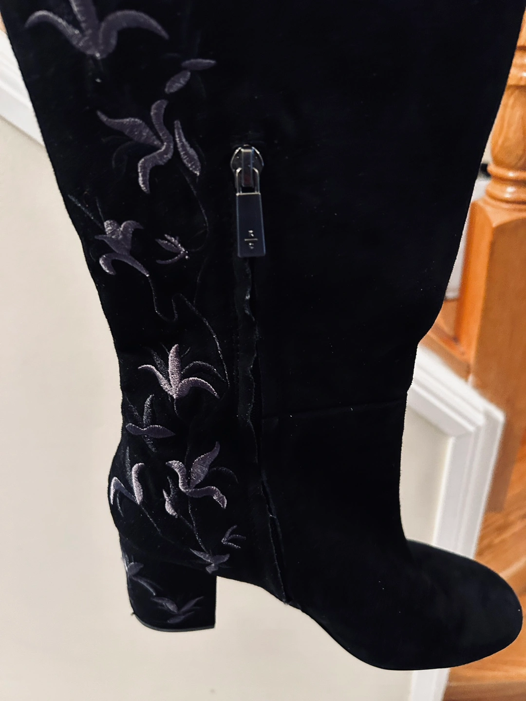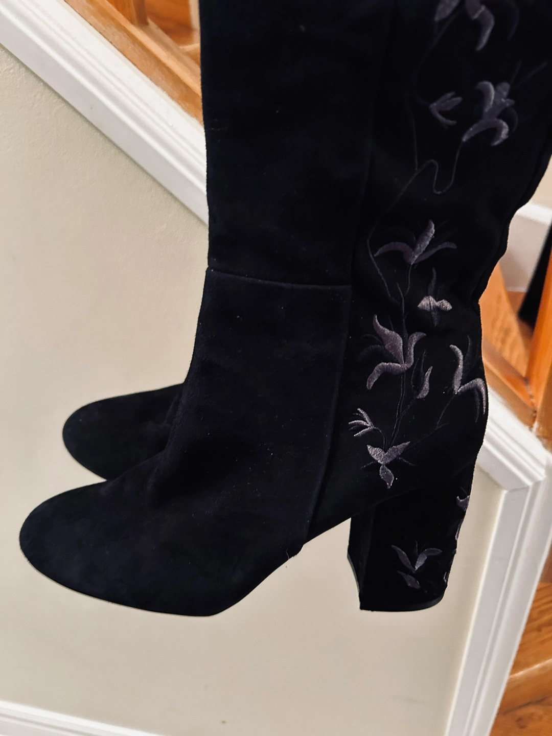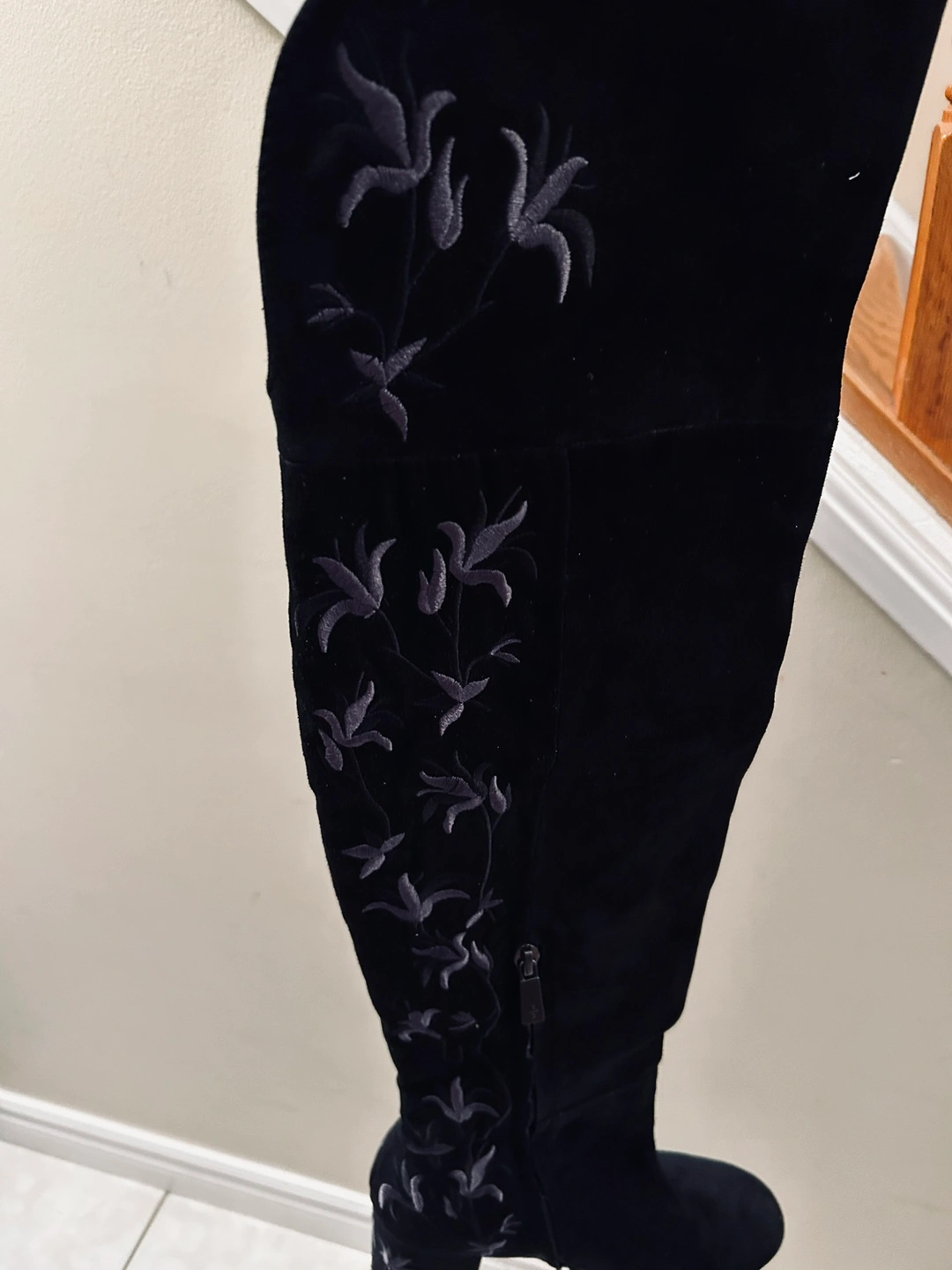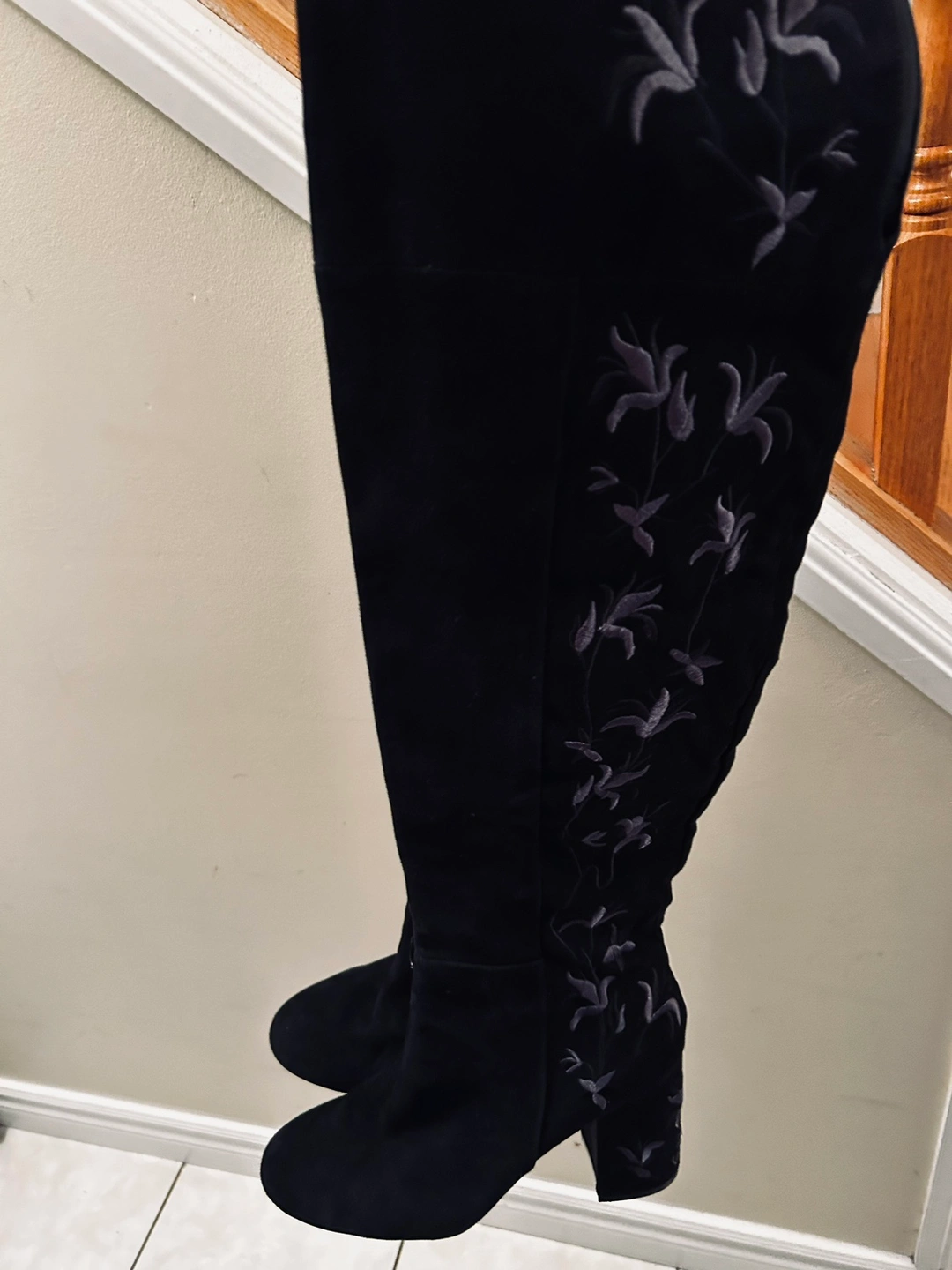 Suede over-the-knee boots with a block heel and side zipper. The boots feature an embroidered floral design on the side.