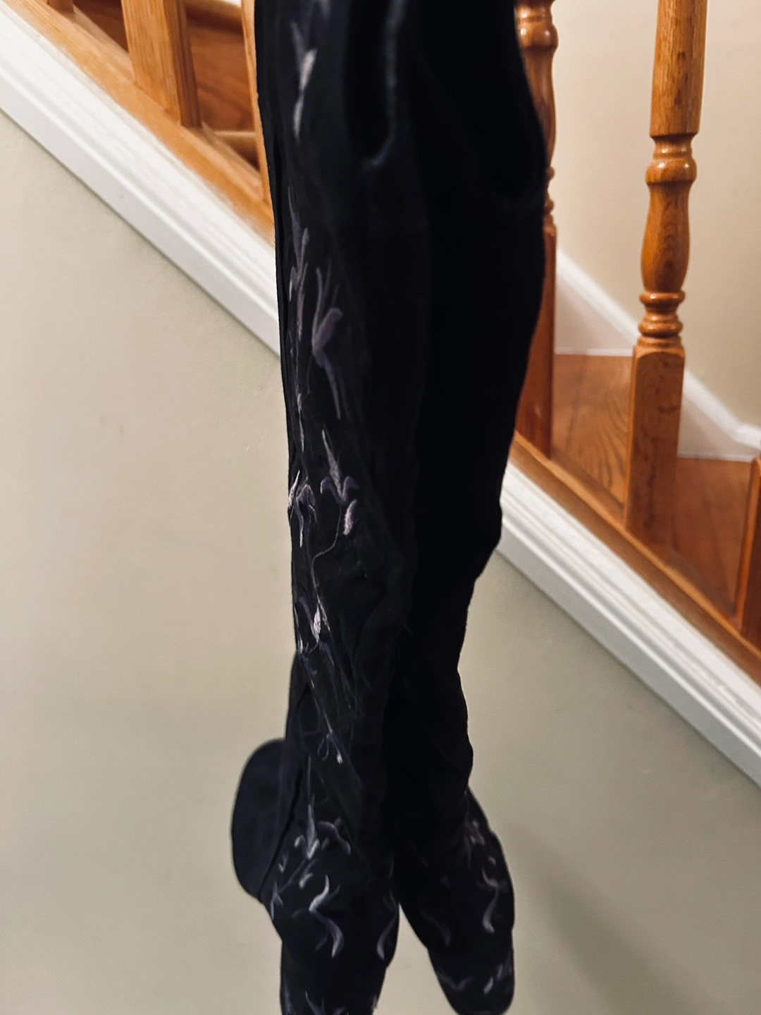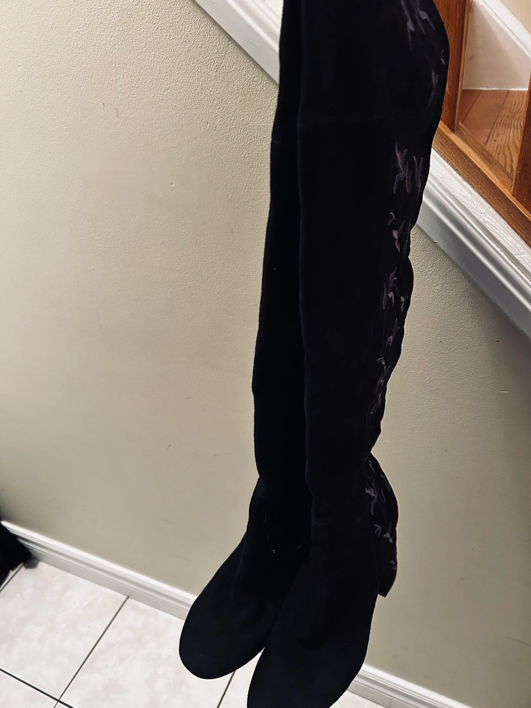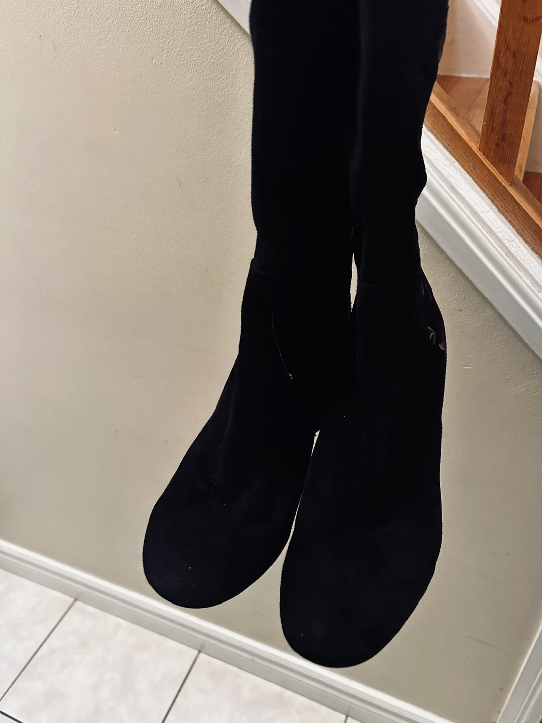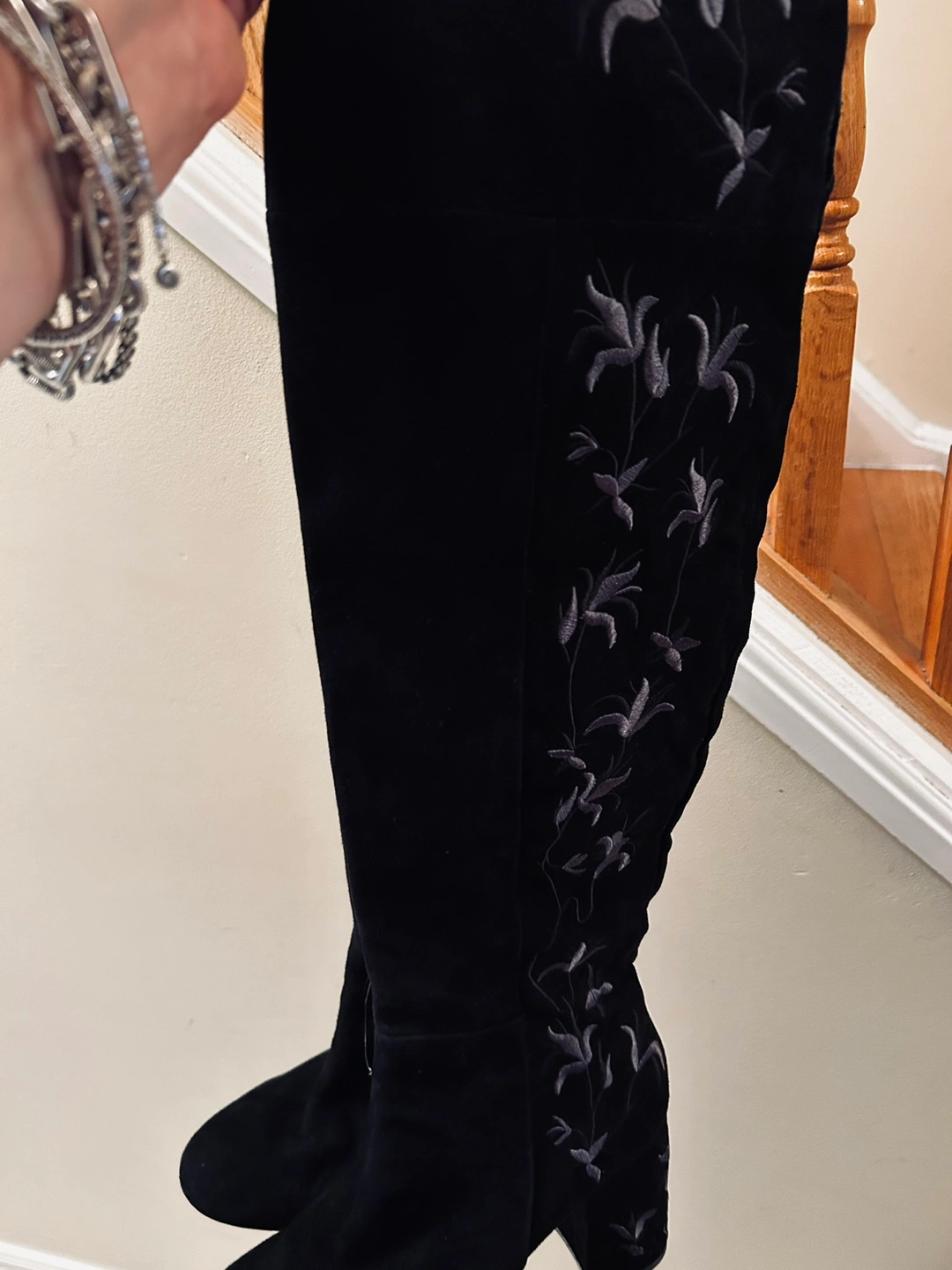 Suede over-the-knee boots with a block heel and side zipper. The boots feature an embroidered floral design on the side.