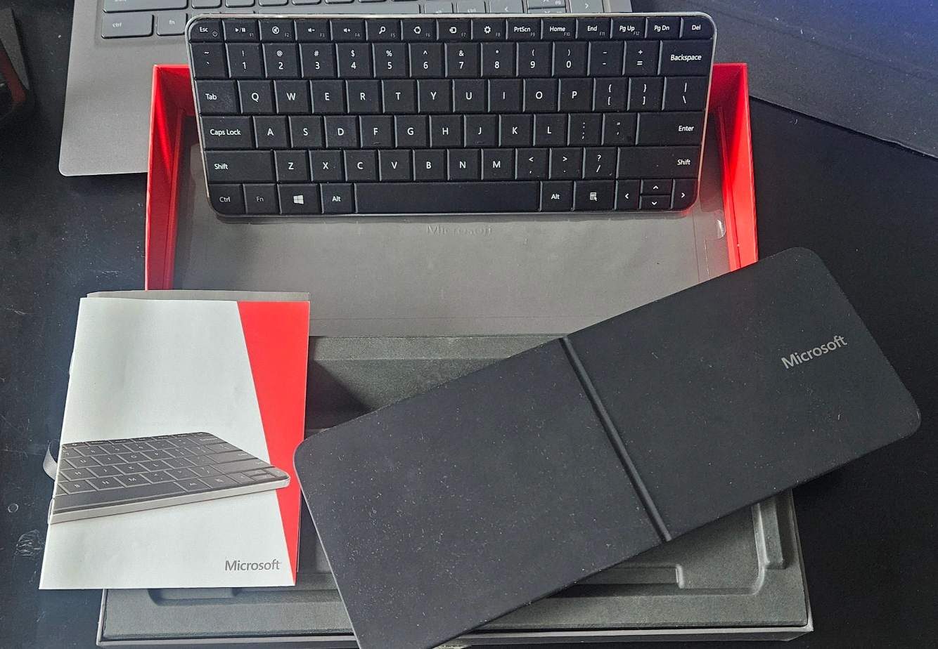Microsoft Wedge Mobile Keyboard Black Bluetooth keyboard with protective cover and tablet stand.