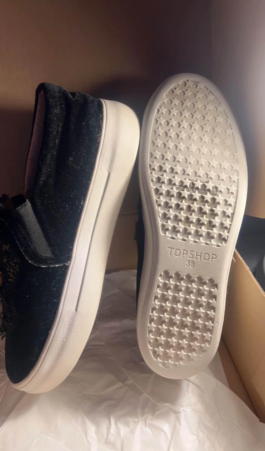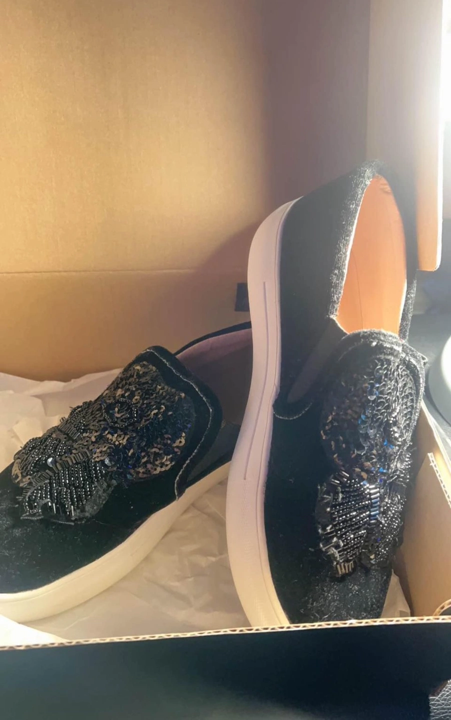 These are black velvet slip-on sneakers with sequined embellishments. They have a white rubber sole. They are size 38.
