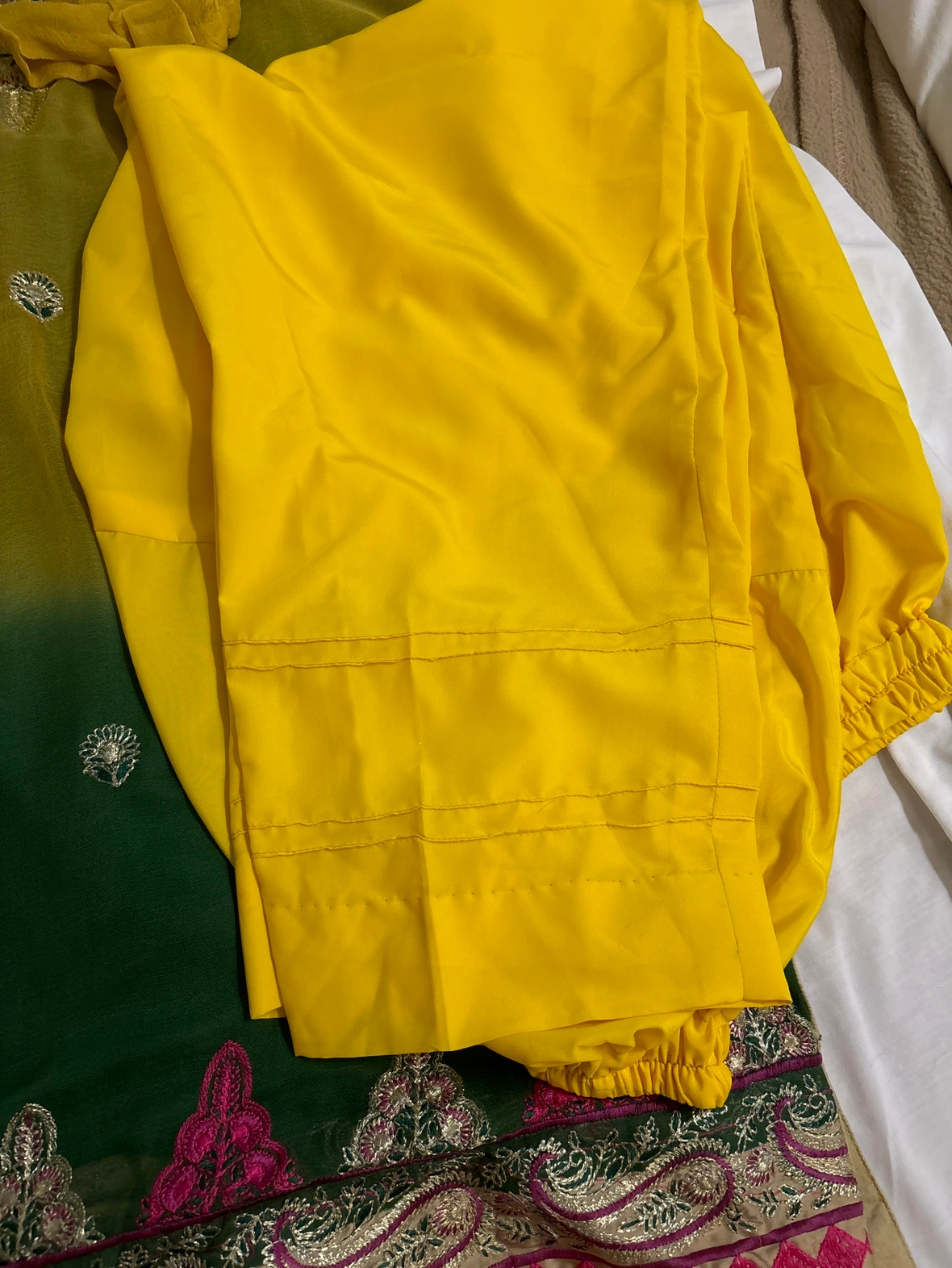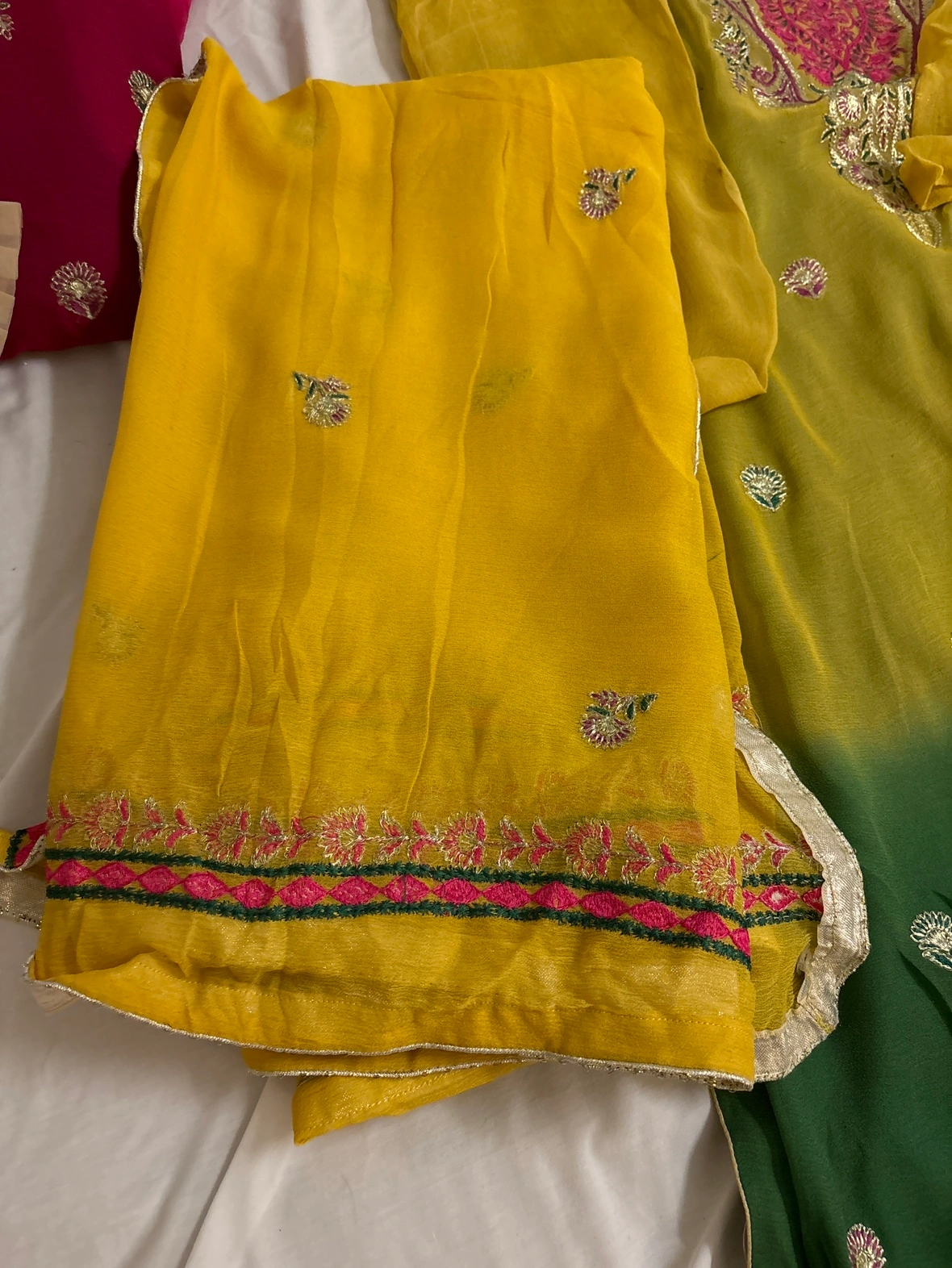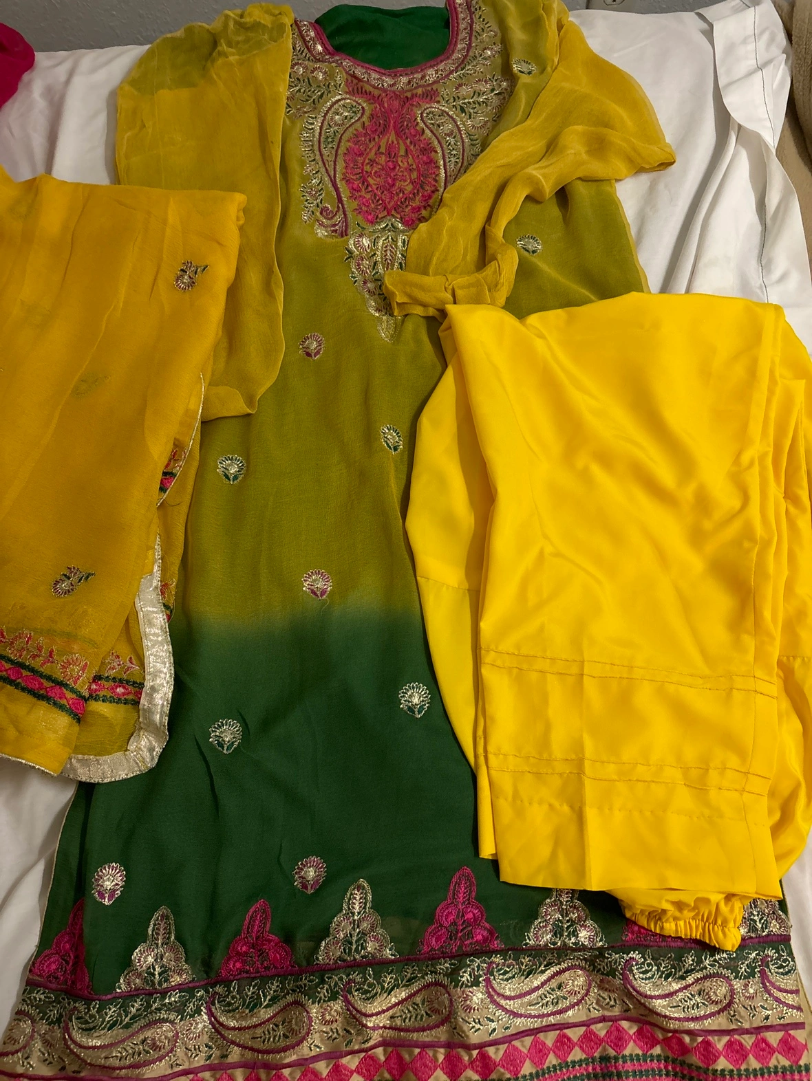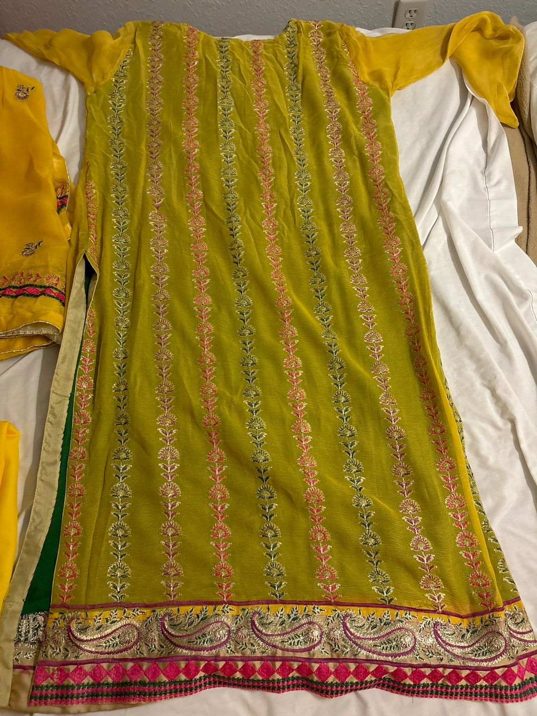 Three piece suit including a long-sleeved top, pants, and a dupatta. The top is green and yellow with a pink and gold trim. The pants are yellow and the dupatta is a matching yellow.
