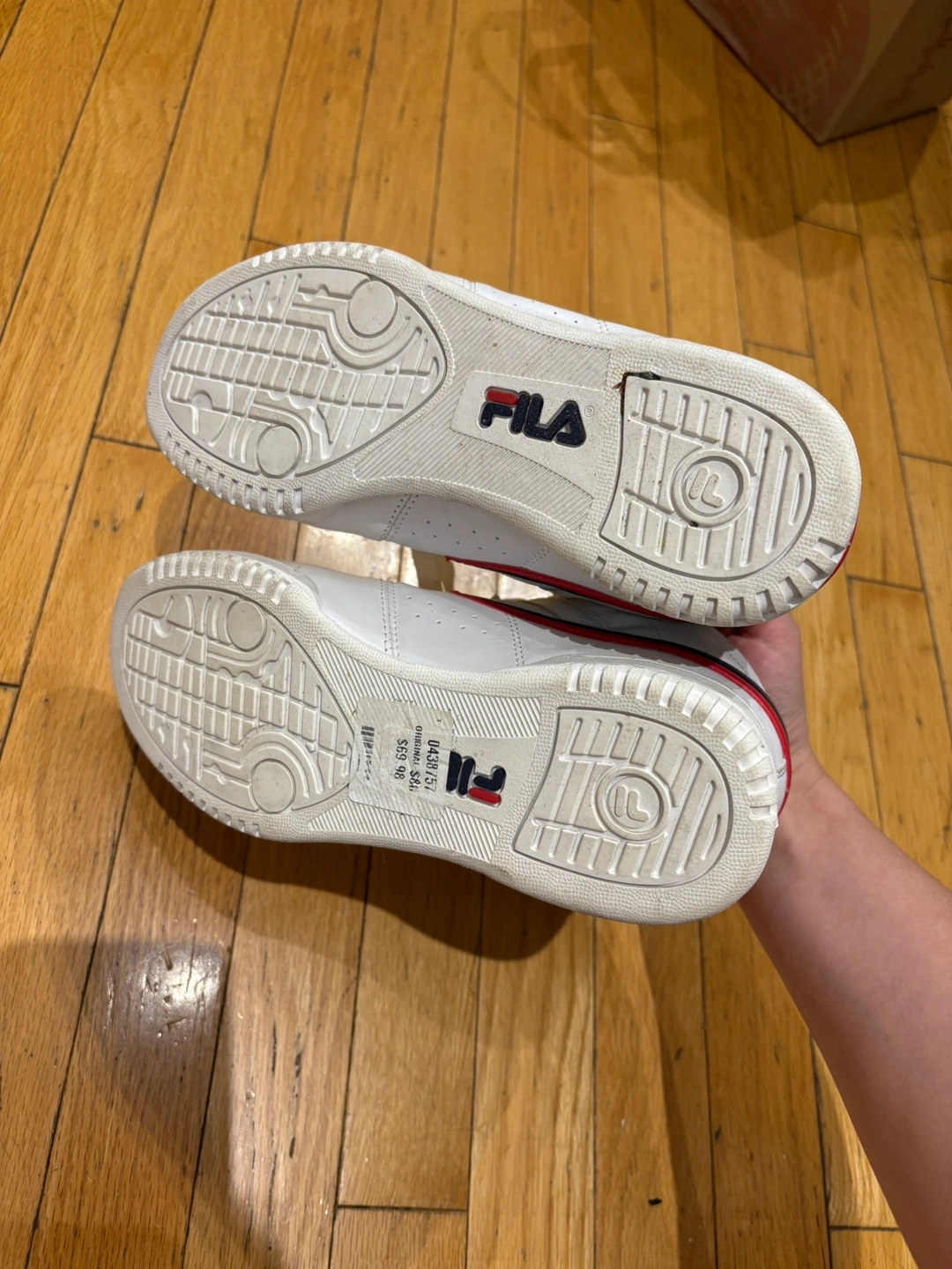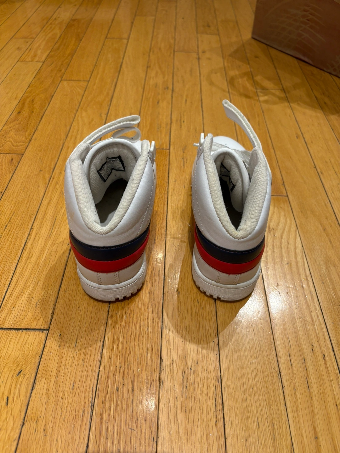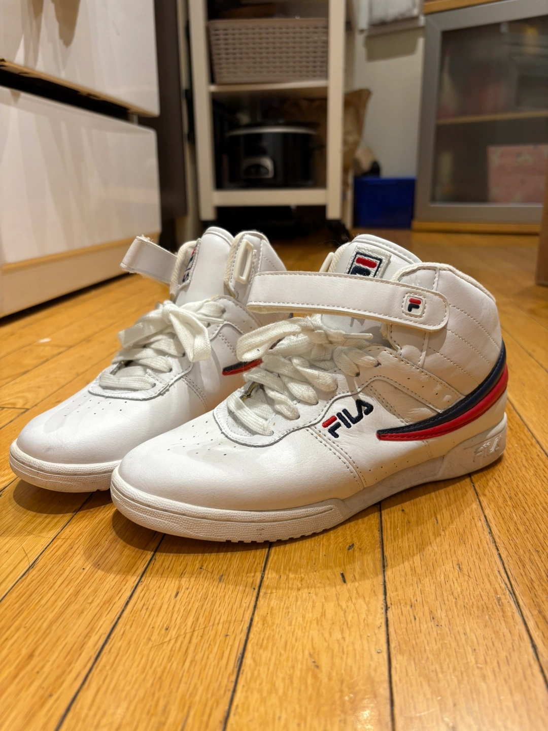 womens high top fila sneakers size 7 classic white with blue/red detail good condition, minimally worn lace-up closure and velcro strap pickup in vancouver grandview woodland or commercial drive