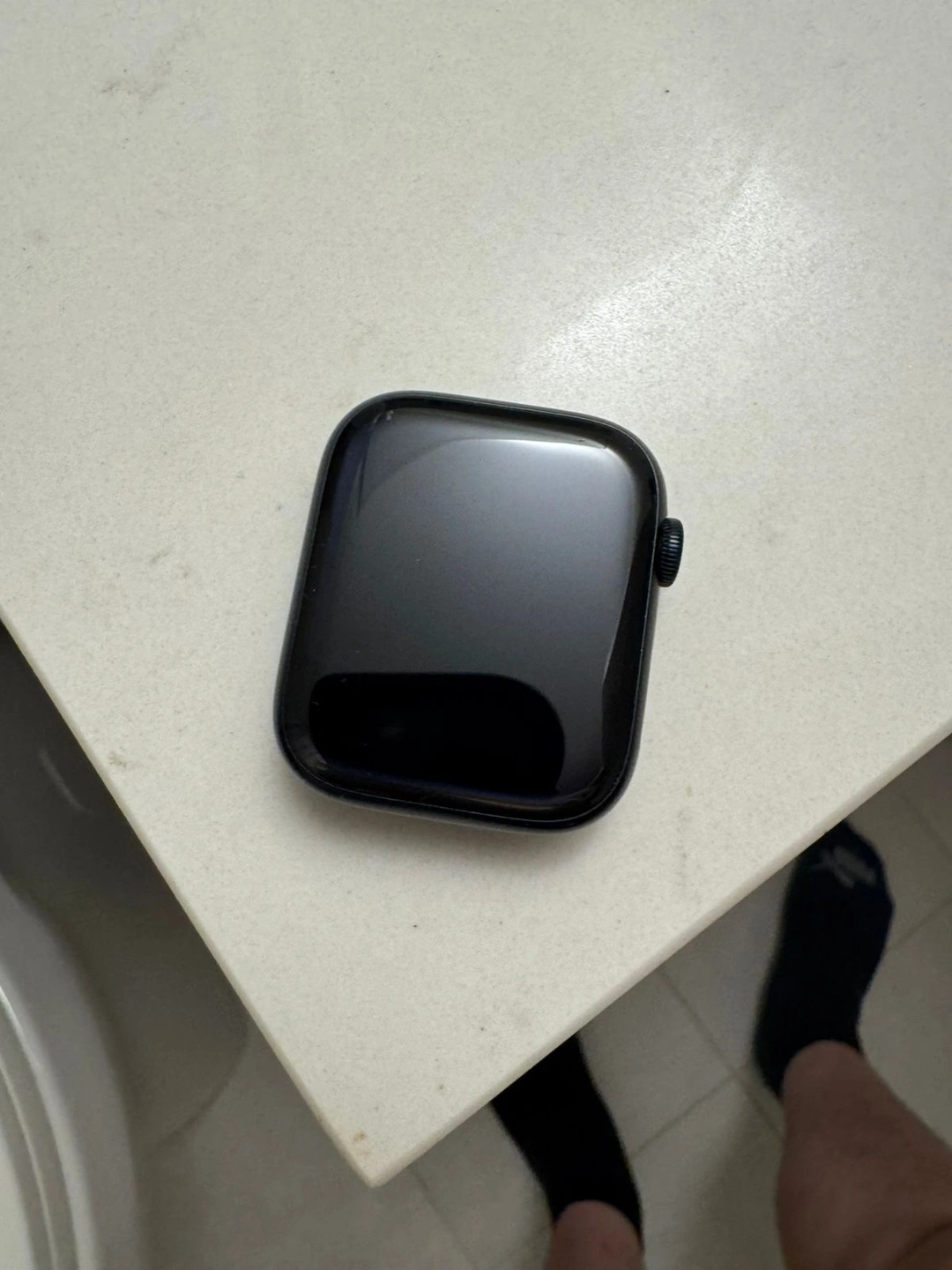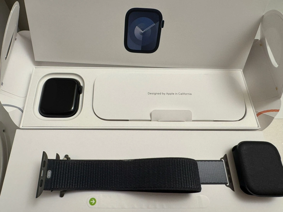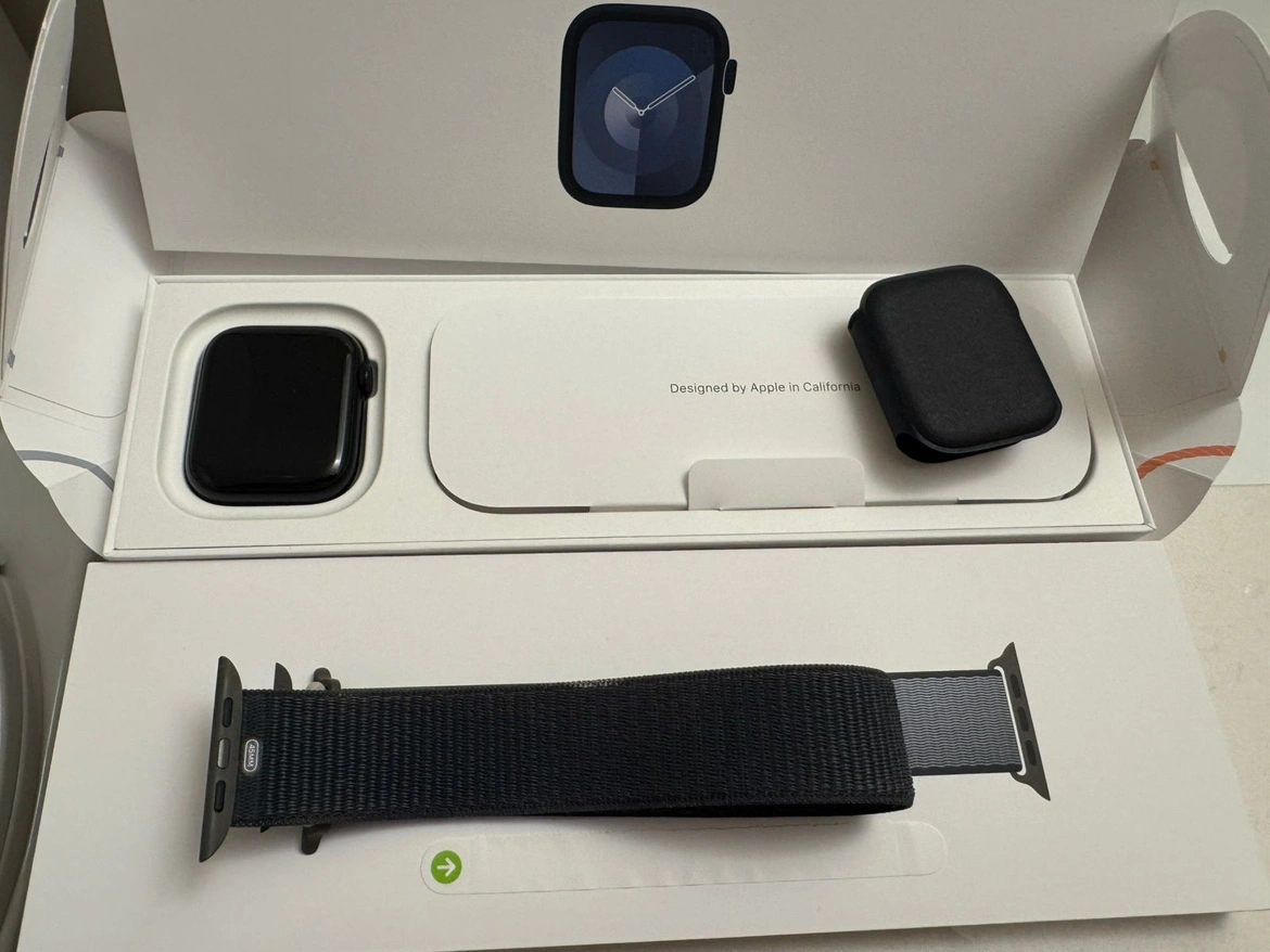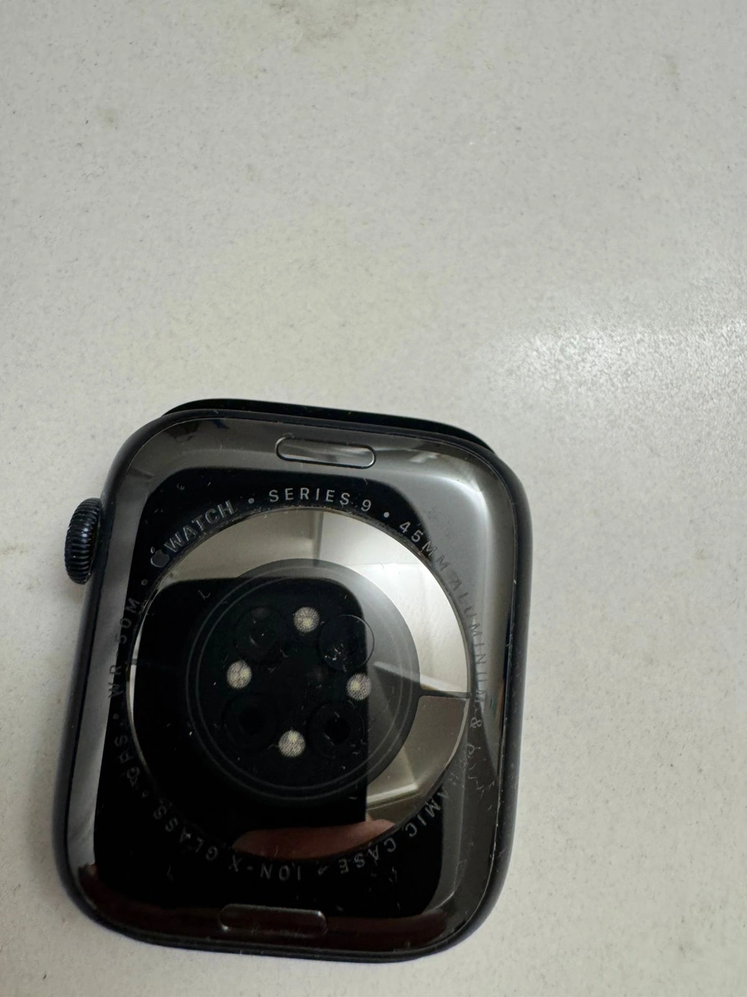 Apple Watch Series 9 with black sport band in good condition. Includes box, charger, and band. 98% battery health.