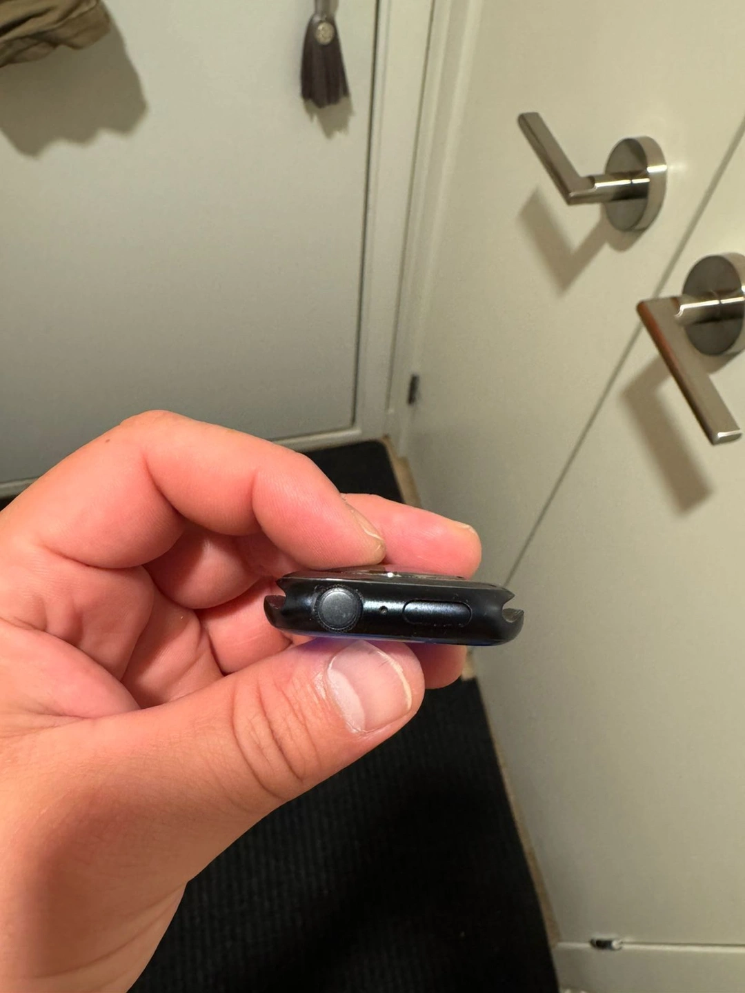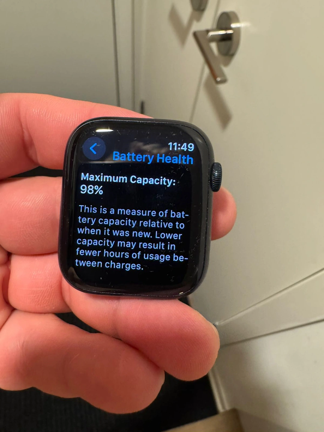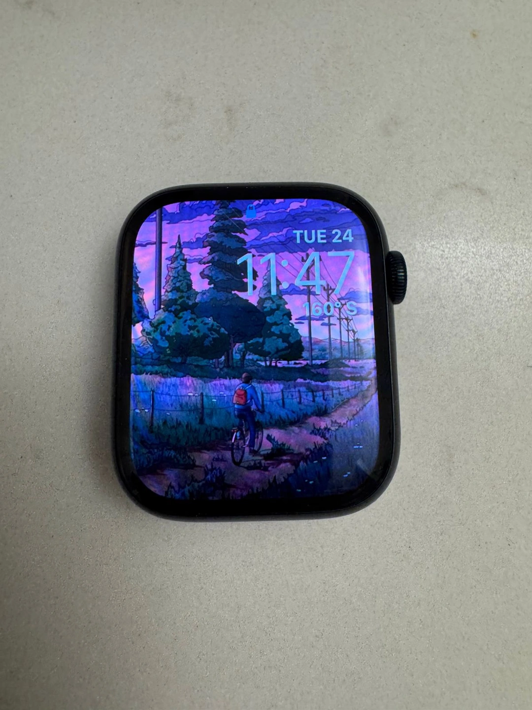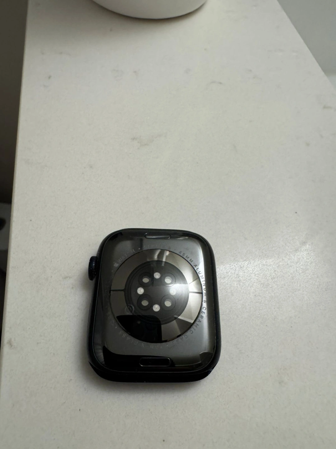 Apple Watch Series 9 with black sport band in good condition. Includes box, charger, and band. 98% battery health.