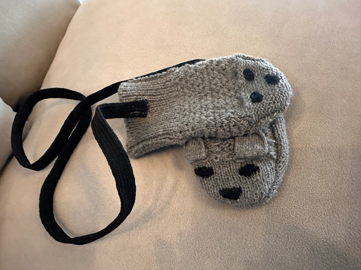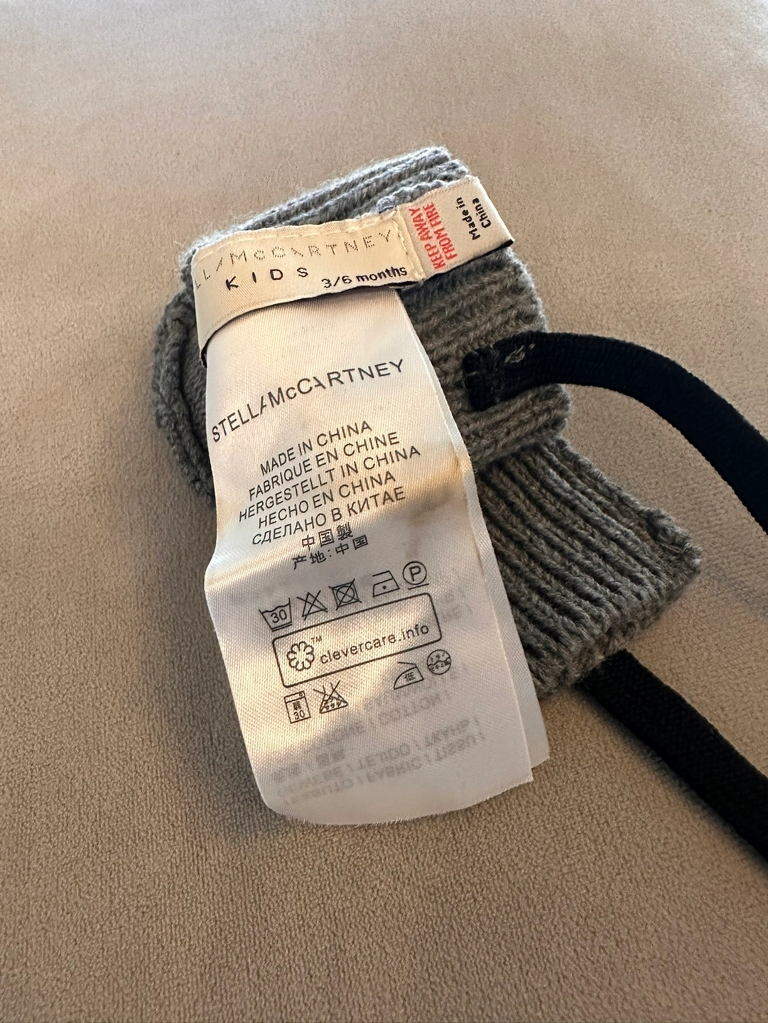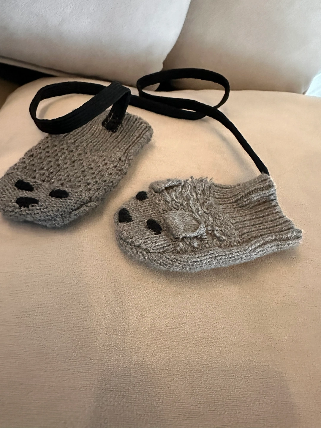 Never worn. Grey baby mittens with paw print detail and a black strap to keep them attached. Size 3/6 months. Smoke free, pet free home.