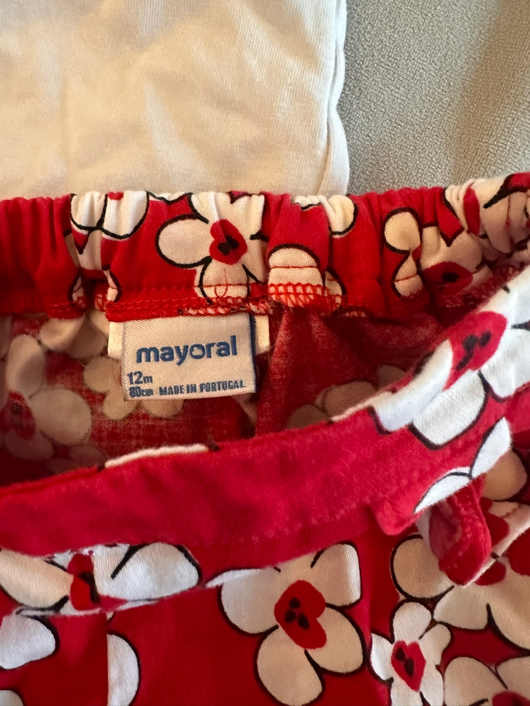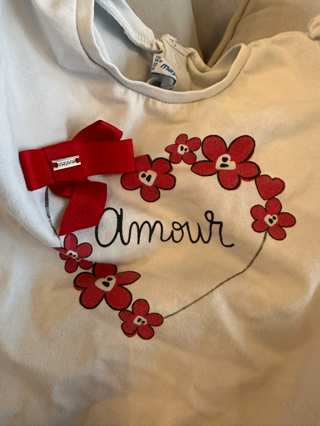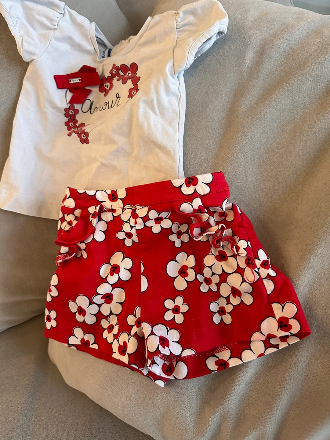 Short-sleeved white top with red flower heart design and red shorts with white flowers. Adorable outfit, very gently used. Washed in baby detergent on delicates cycle. Smoke free, pet free home.