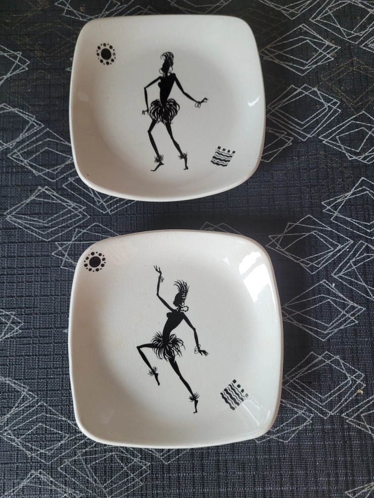 Two square plates featuring a black silhouette of a woman in a skirt with geometric patterns. Made in England by Wade. link to same item on etsy for comparison https://www.etsy.com/ca/listing/1260008279/1950s-vintage-wade-2-zamba-tribal?click_key=ea61a0c41985fb99fde5c3f1757e009a5df089a3%3A1260008279&click_sum=418e71aa&ga_order=most_relevant&ga_search_type=all&ga_view_type=gallery&ga_search_query=wade+zamba&ref=sr_gallery-1-1&organic_search_click=1&content_source=e83b8d06ed3addb0659e8736c33310943493b6f9%253A1260008279