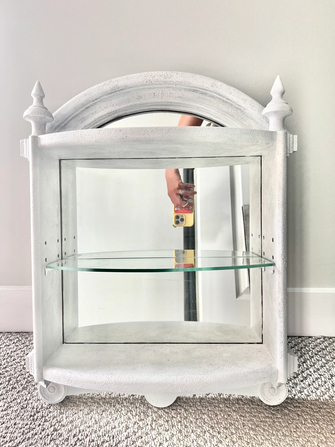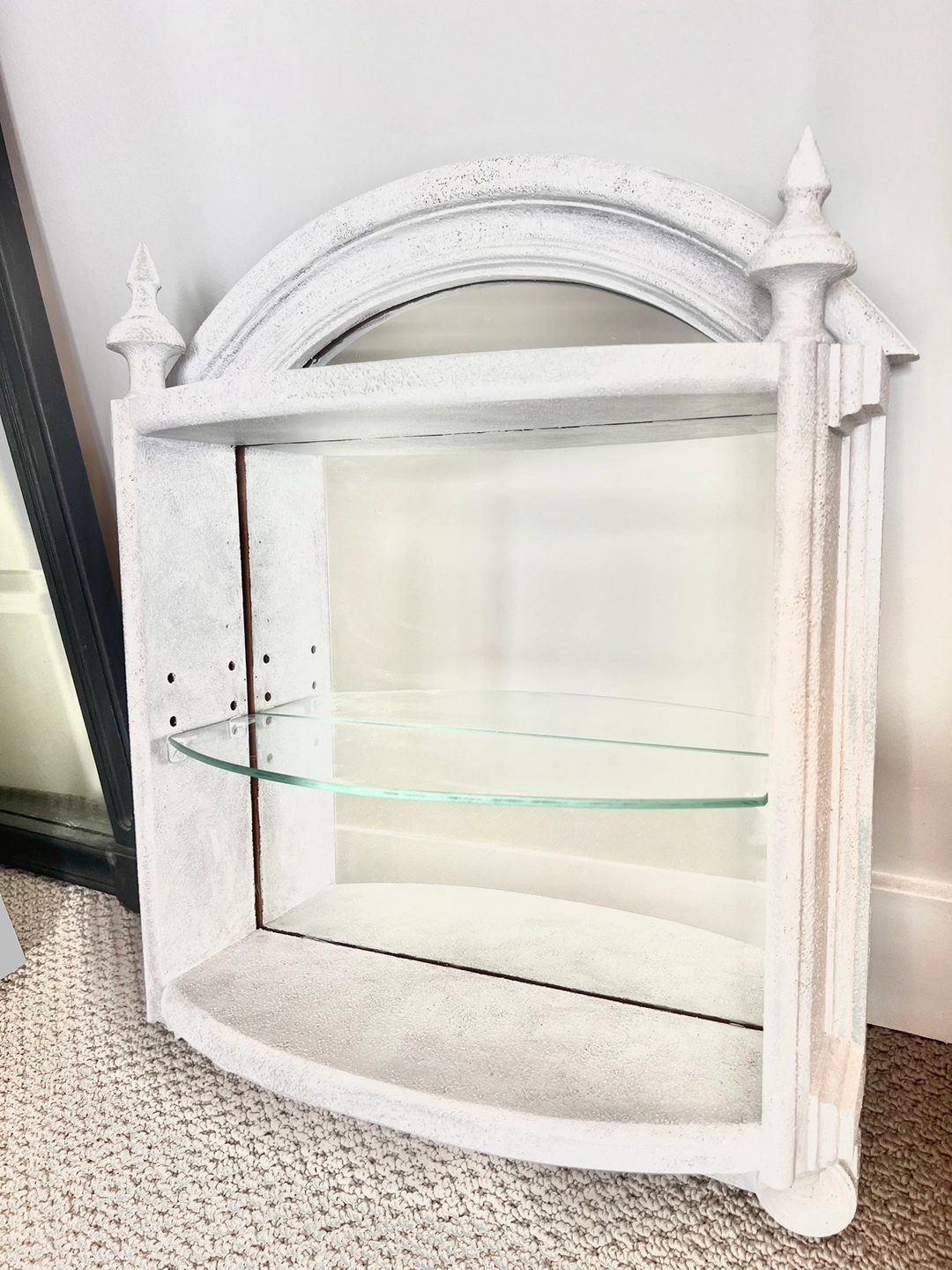 A white wall shelf with a mirror and one glass shelves. The shelf has a rounded top and features decorative accents at the top. It is in used condition, but in good shape. (Cash Only )