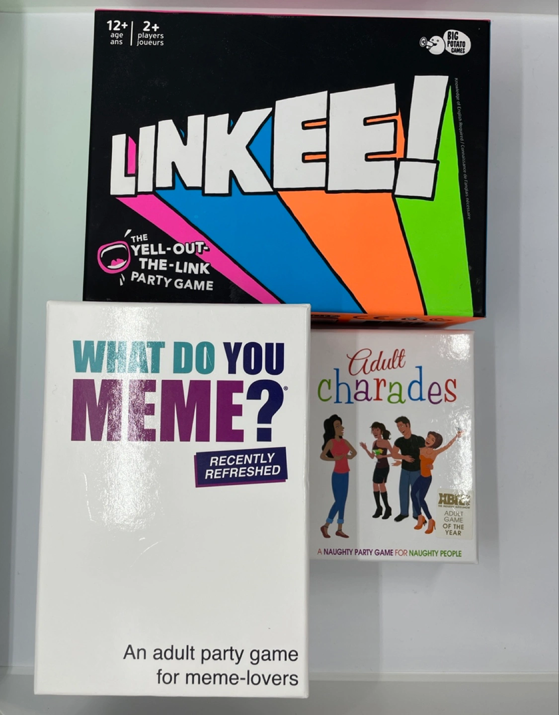 A bundle of party games including What Do You Meme, Adult Charades, and Linkee! Holiday season is around the corner. These games are perfect for any party/ get together! Retail value $90 All games are in like new condition. Moving sale, open to offers.