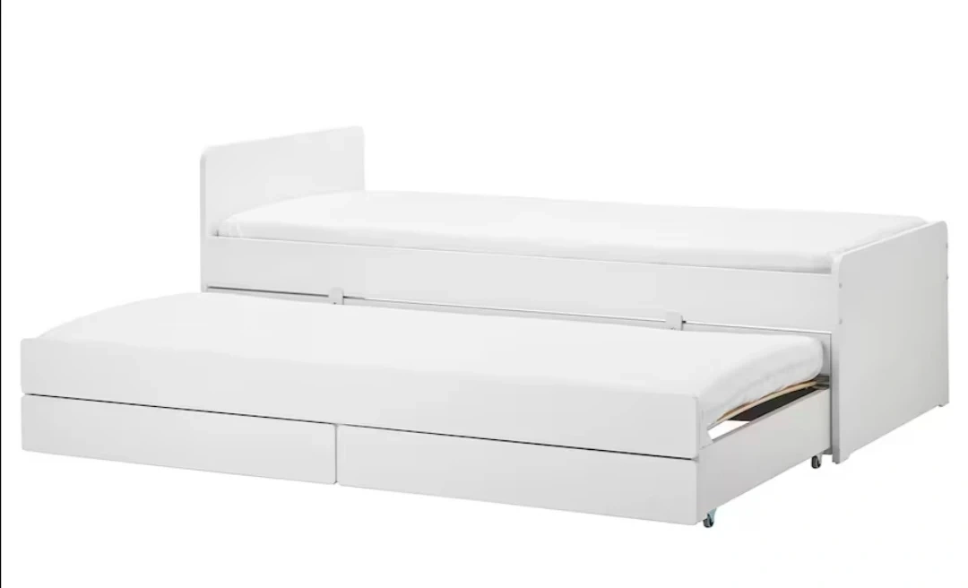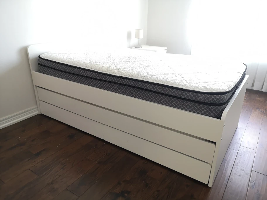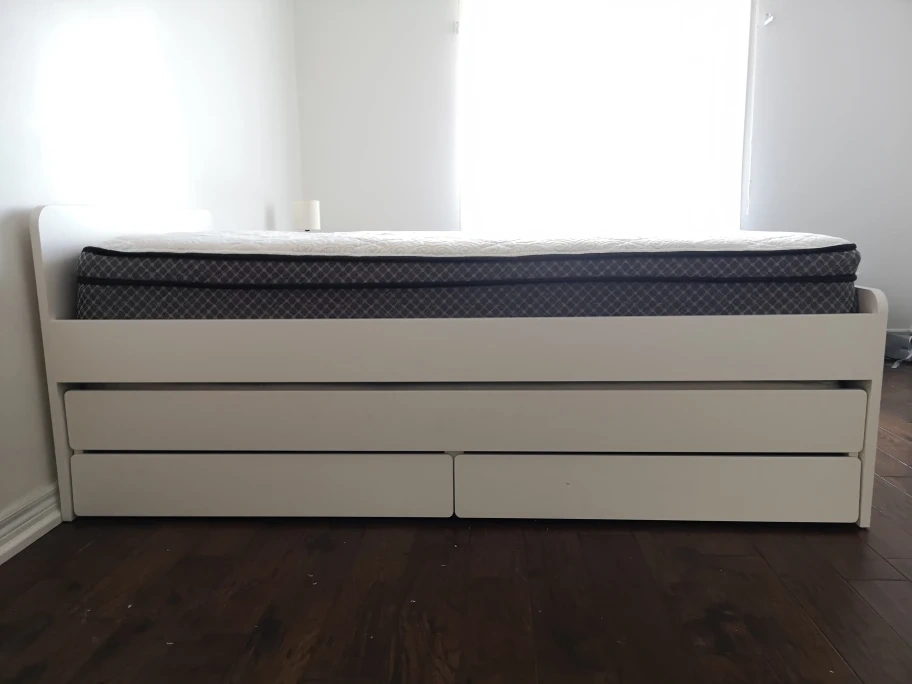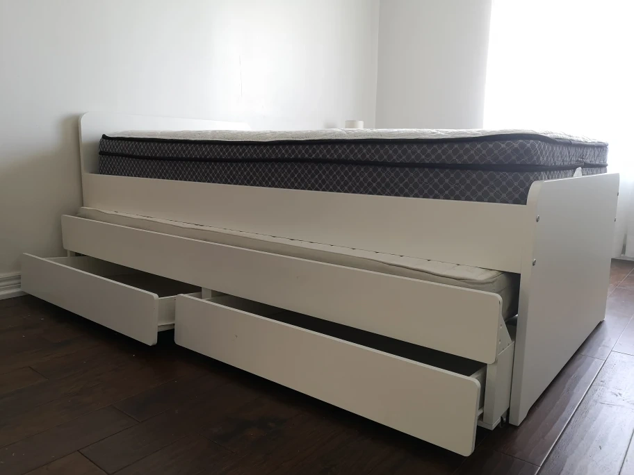 White pull-out twin bed frame with two large drawers for storage. Includes mattresses (the top one is used, the one in the pull-out bed is brand new). Three (3) units available, $120 each.