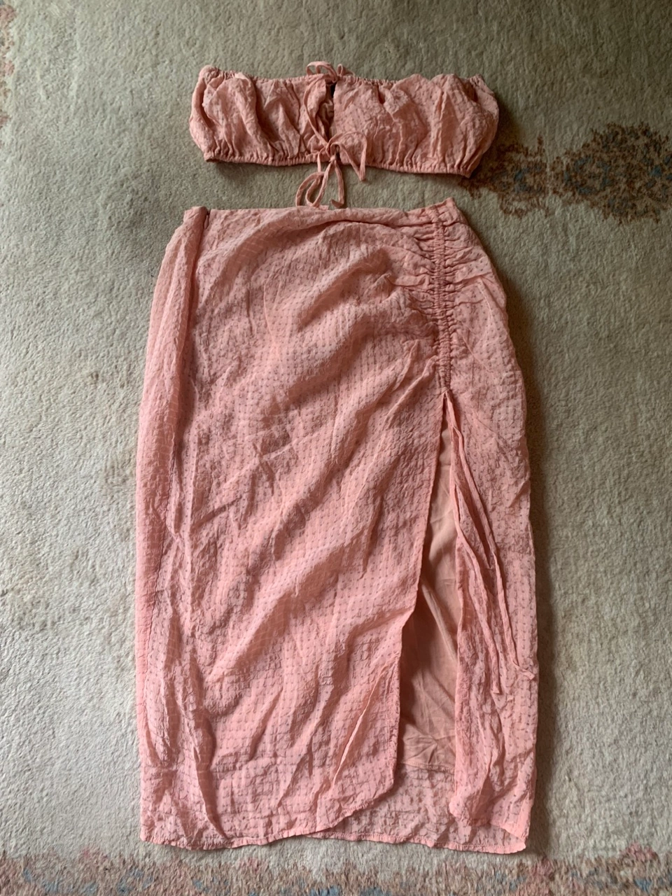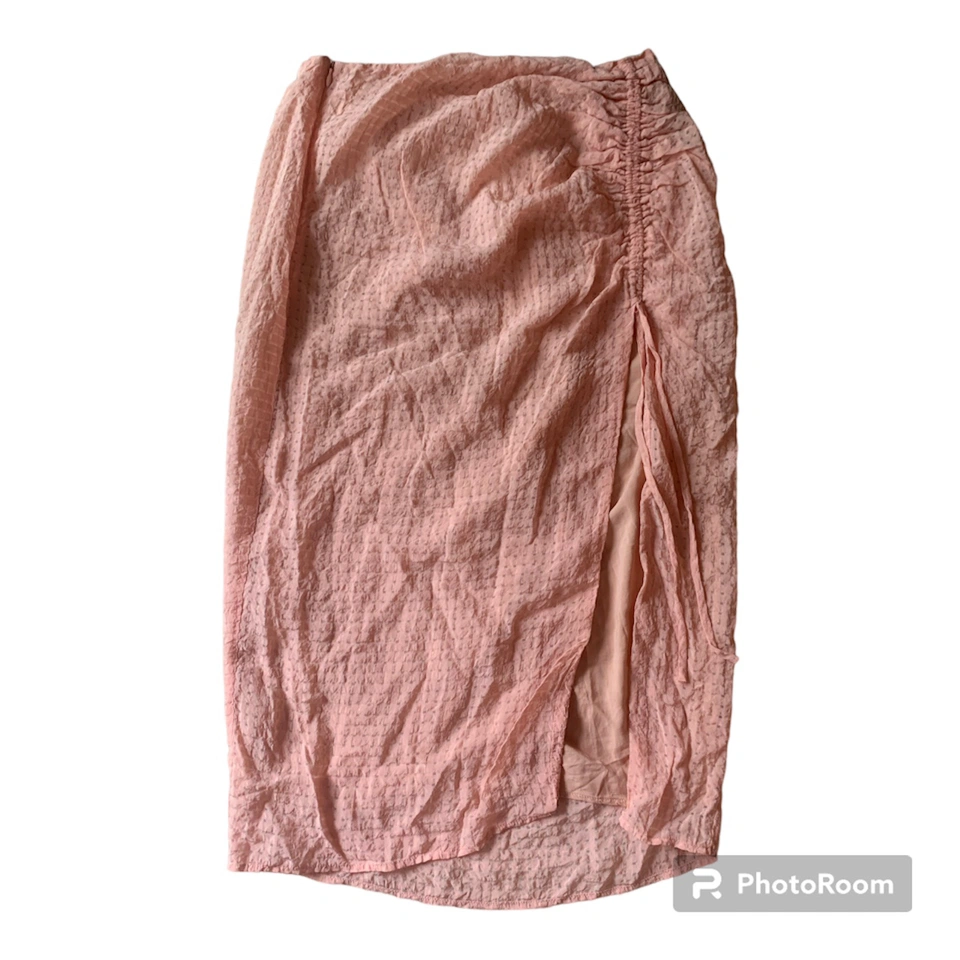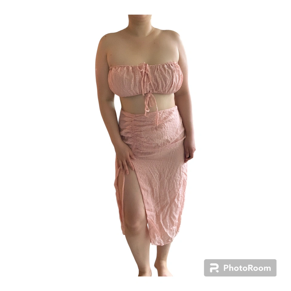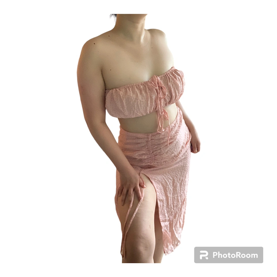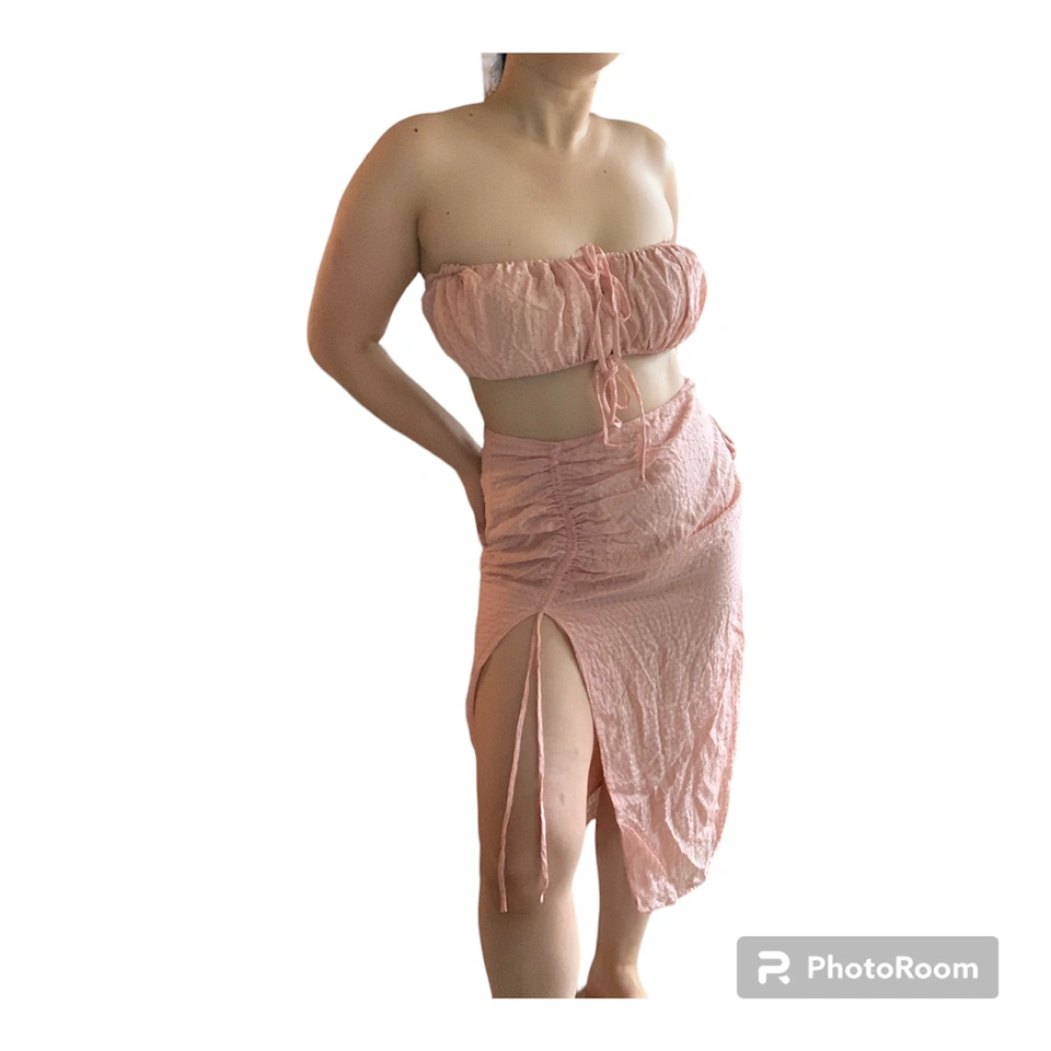 Item: Majorelle Two-Piece Bandeau & Slit Skirt Set Condition: 10/10. No Stains/Rips/Tears. Measurements (Inches): **Clothing measured on flat surface - ONLY LEFT TO RIGHT - NOT ALL AROUND CIRCUMFERENCE Bandeau Top: Size: Medium Chest left to right: 16 + (Stretch and Adjustable to your Bust Size = Bust Hem Line has Elasticity and Adjustable Bow Tie Strings) Skirt: Hip Line: 14 Length of Skirt from Top to Bottom: 32 Length of Slit in Skirt: 20 Details: Brand: Majorelle Color: Soft Pink with Patterned Squares Material: Shell: 87% Viscose 13 % Nylon Lining: 95% Rayon 5% Spandex Style: Feminine & Preppy / Summer Set / Zipper at the Side / Scrunced Ribbing Slit / Underlying under the Skirt Original Price: $125USD Selling for half!!! Local pick up downtown Toronto!