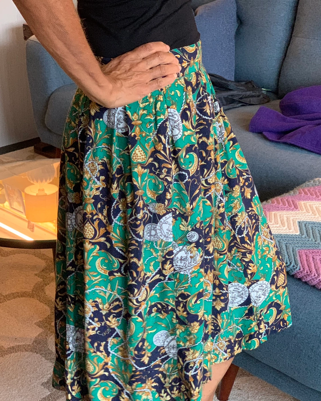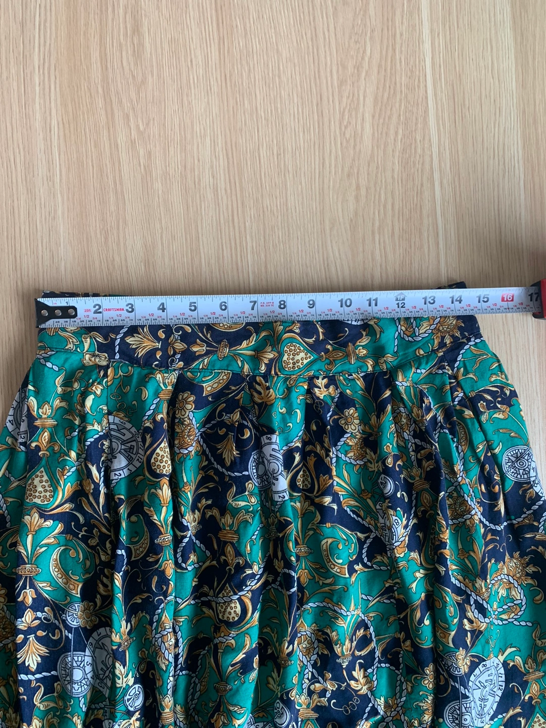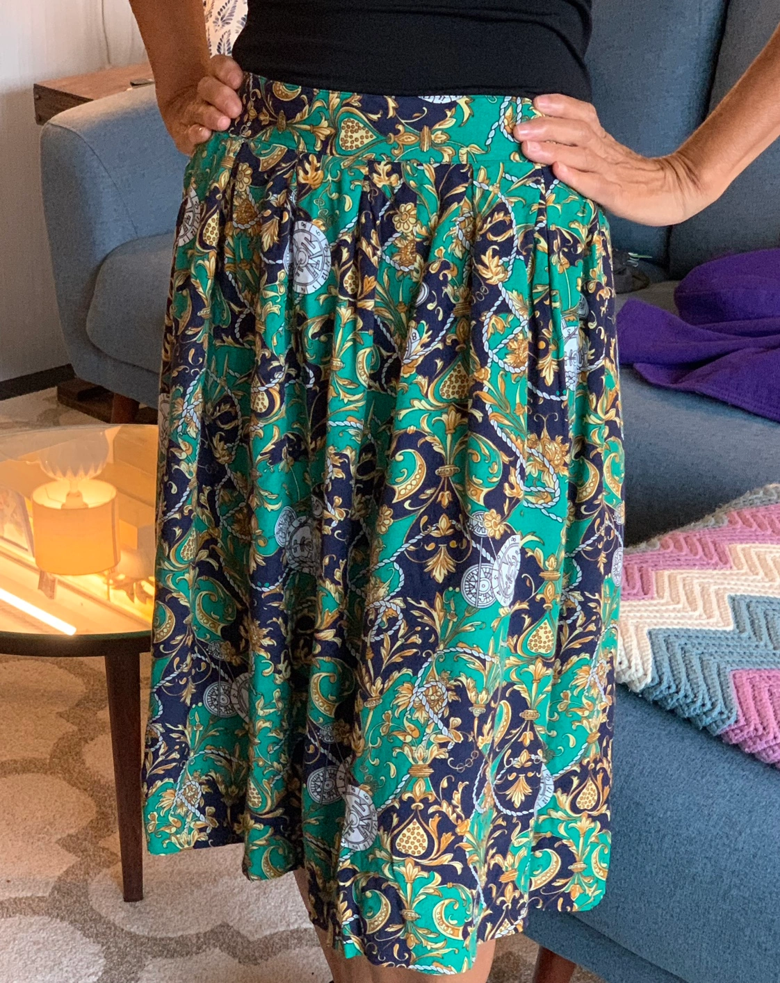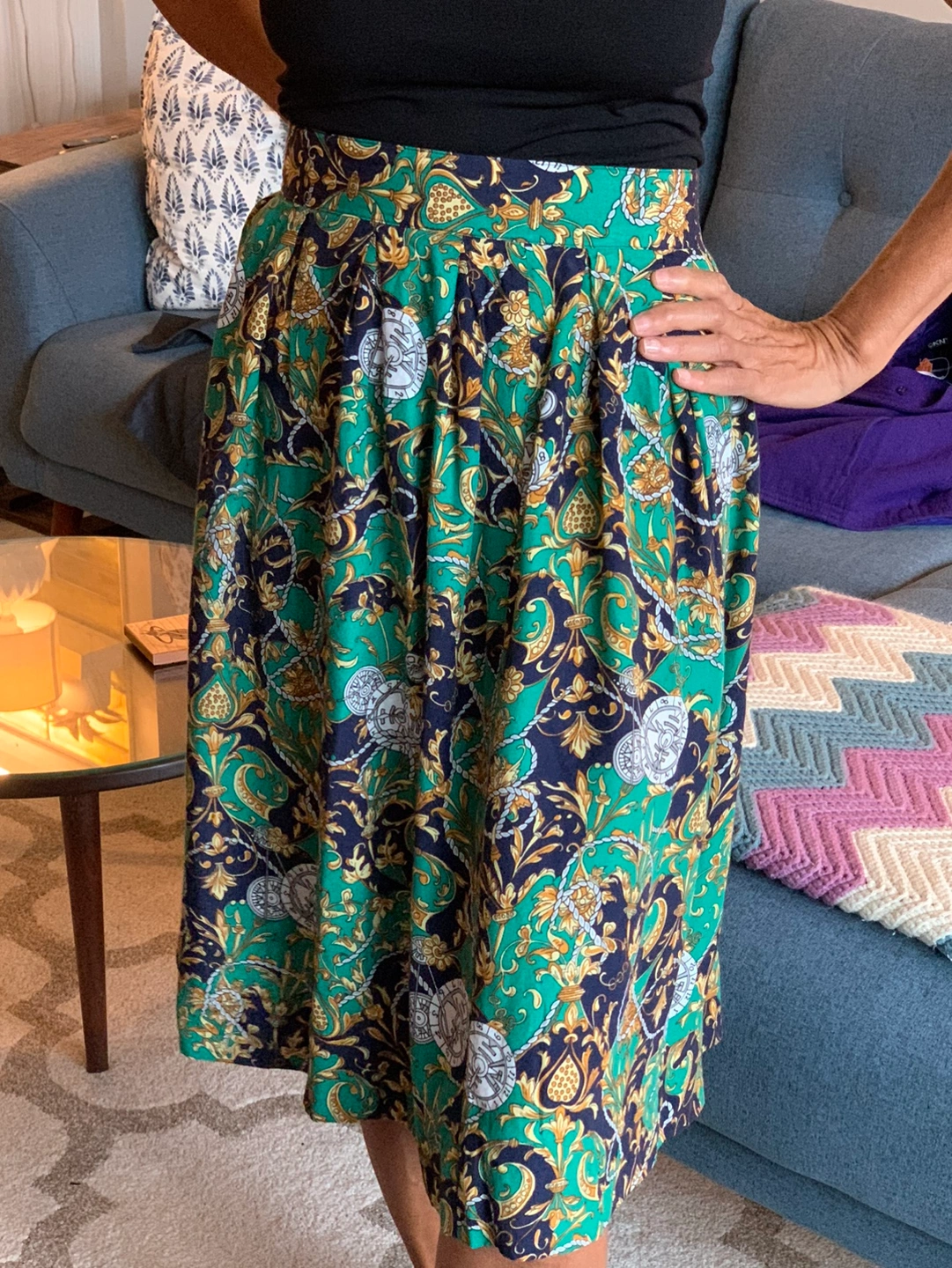 Green, gold, and blue patterned skirt with a high waist and pleats. Fastens with buttons. No major flaws to note. See photos for measurements, feel free to ask me about sizing questions and for more measurements. Happy to help! Compare measurements to a similar item you own. Model is a size SMALL 5-7 Model is 5’7 in height Smoke and pet free home ⭐️Hello, my name is Jasmine. I recently moved to Toronto from the U.S. where I used to sell vintage and secondhand clothing. I brought my remaining stock with me, and items are priced to move. I am friendly and always happy to answer any questions - so feel free to message me! I live near the intersection of Bathurst and Eglinton. I prefer pickup, but will consider delivery if I’m in the area or at an extra cost. Open to offers!’⭐️