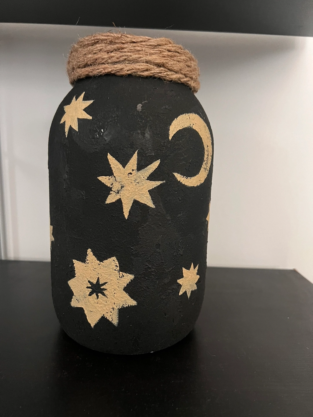 This jar features a black base with a hand painted beige moon and stars design. It is finished with a twine band around the top. It would be a great piece for a shelf, table, or to use for holding trinkets. The jar has a unique texture and finish. It is approximately 10 inches tall.