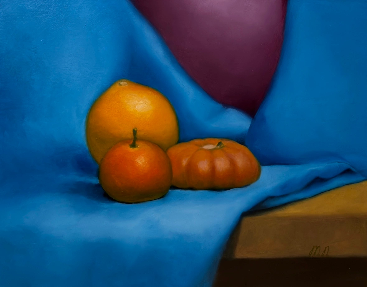 This is a painting of fruit on a blue cloth. The painting is done in oil paints on wooden panel. The size of the painting is 8" x 10". In very good condition. Certificate of authenticity is available upon request.