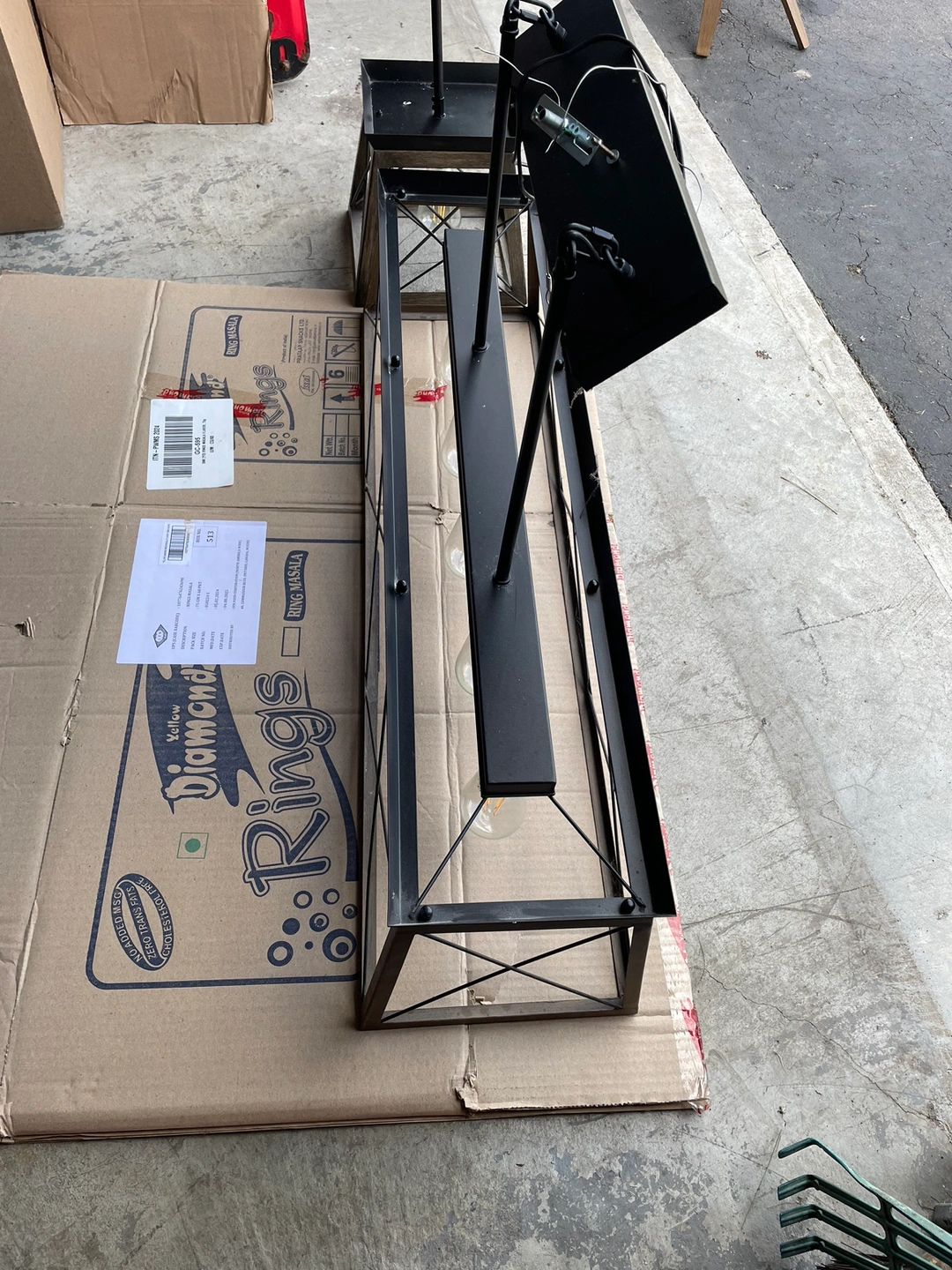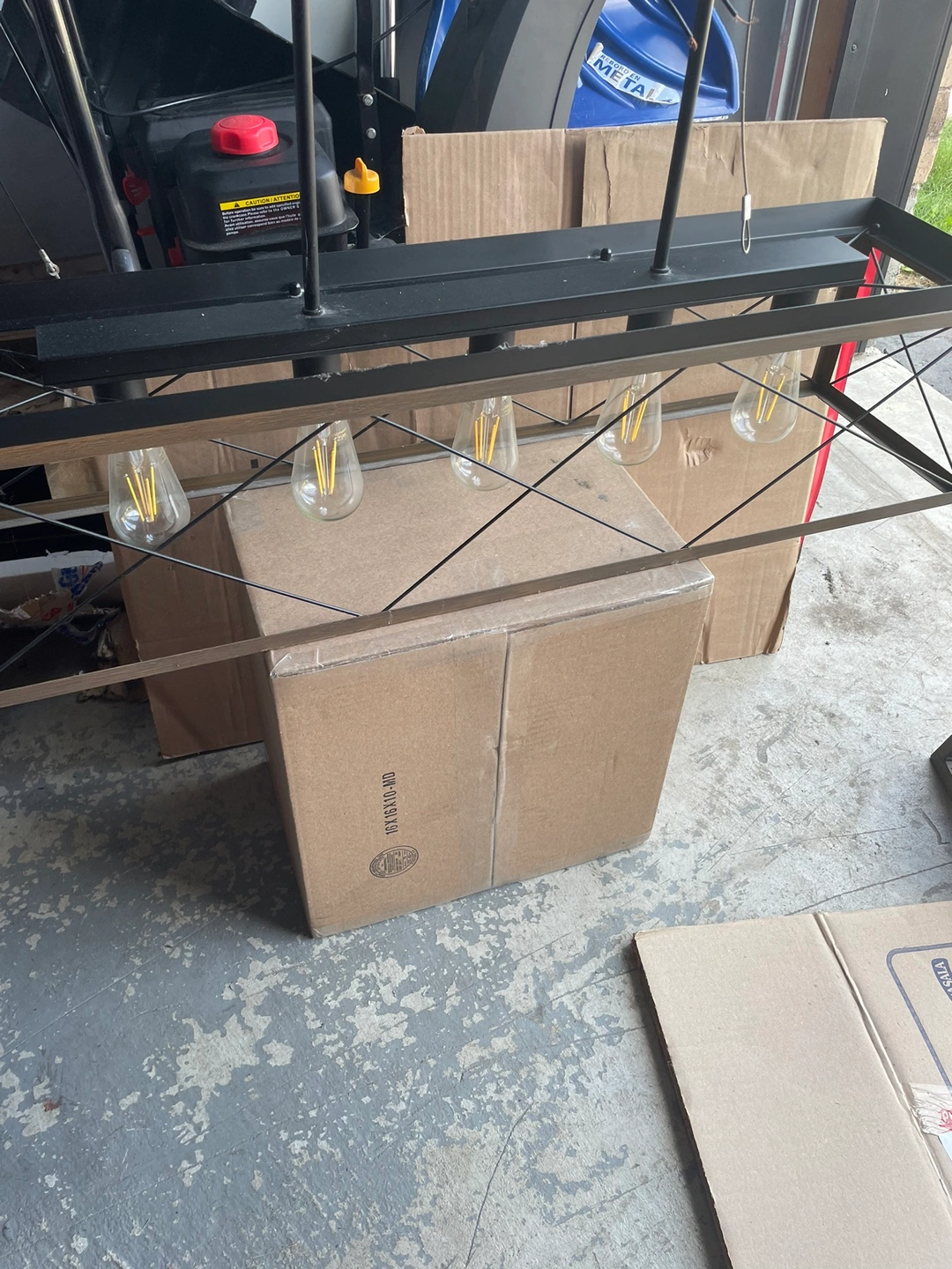 This chandelier features a black finish with gold accents. It comes with five light bulbs. The chandelier is in excellent condition and was only used for a short time.