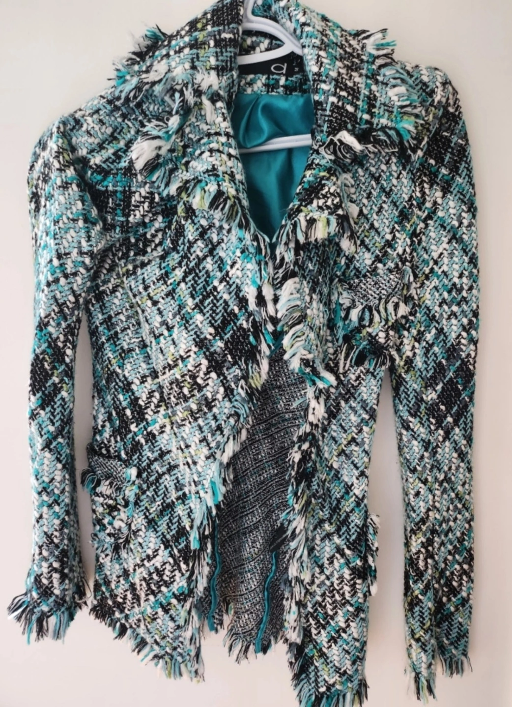 A teal, black, and white fringed jacket with a v-neck and a green satin lining from Dynamite. The jacket is long-sleeved and has a frayed edge around the neckline and the sleeves.