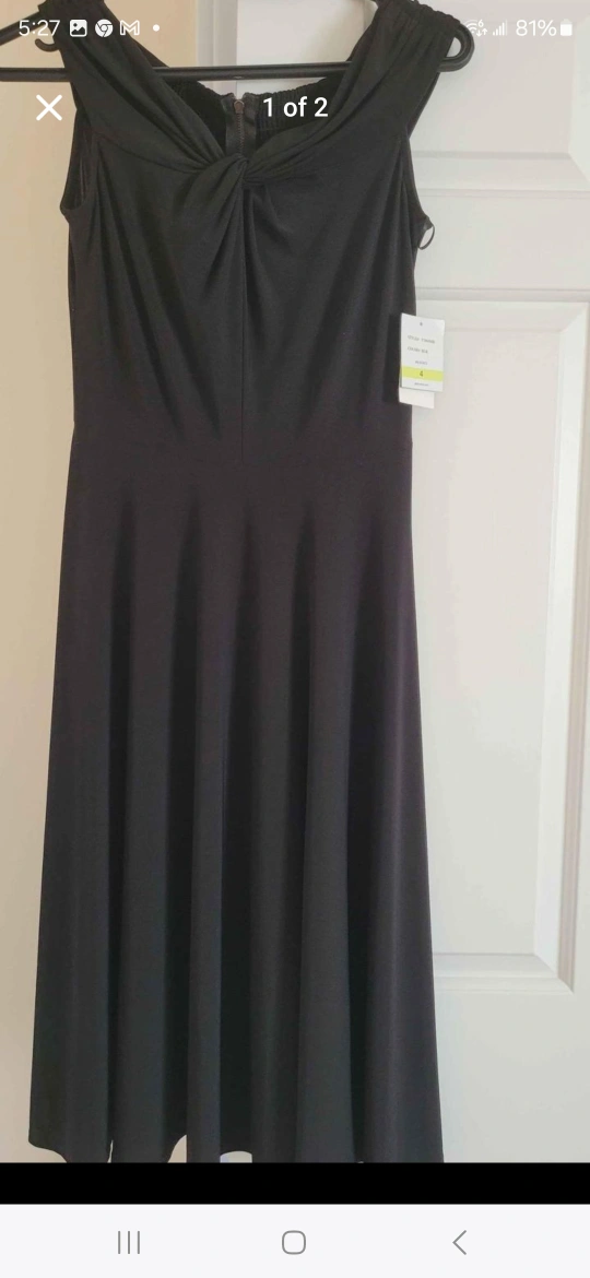 A black sleeveless dress with a knotted detail at the neckline. The dress has a fitted bodice and a flared skirt.