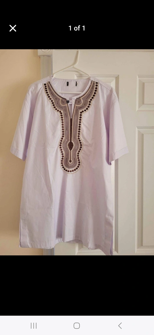 This is a short-sleeved men's shirt with an embroidered design on the front. It is a light purple colour and has a V-neck. I got it in Kenya. Never worn.