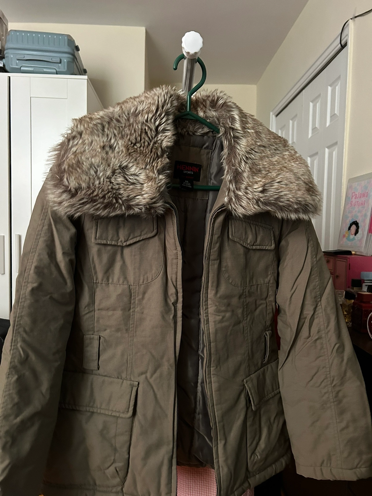 Green jacket with a faux fur collar. The jacket has a zipper closure and two pockets.