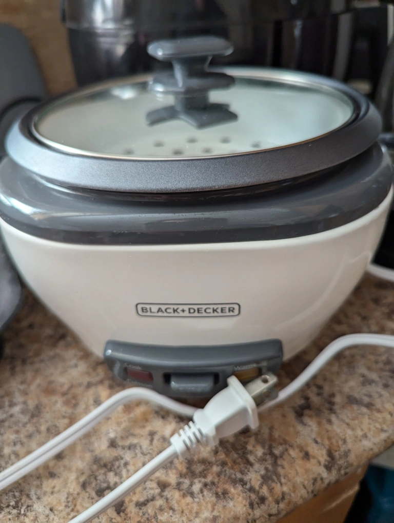 Black + Decker 6-cup rice cooker and food steamer. Includes a steaming basket and nonstick inner pot. Comes with a power cord. Pick up Davenport/ Oakwood.