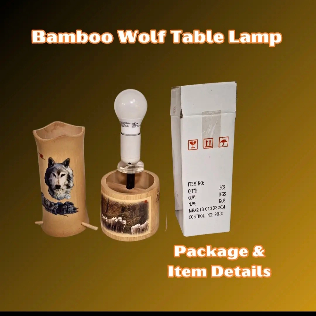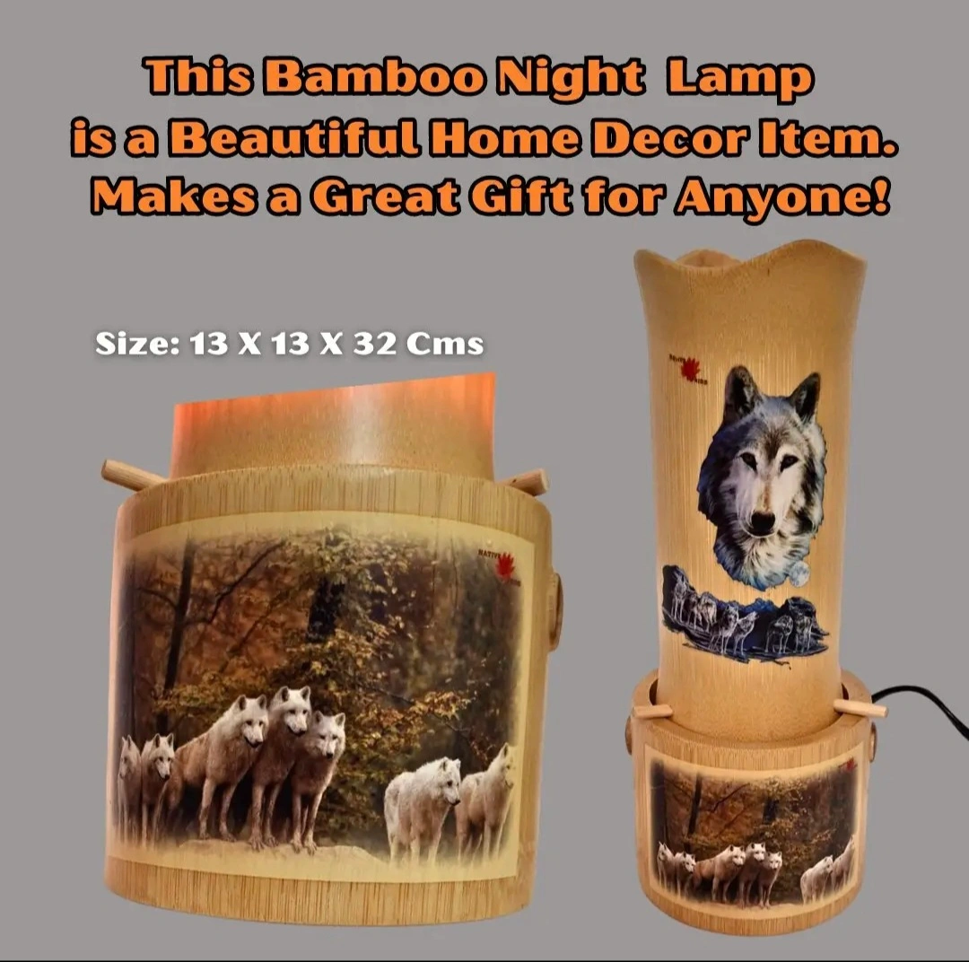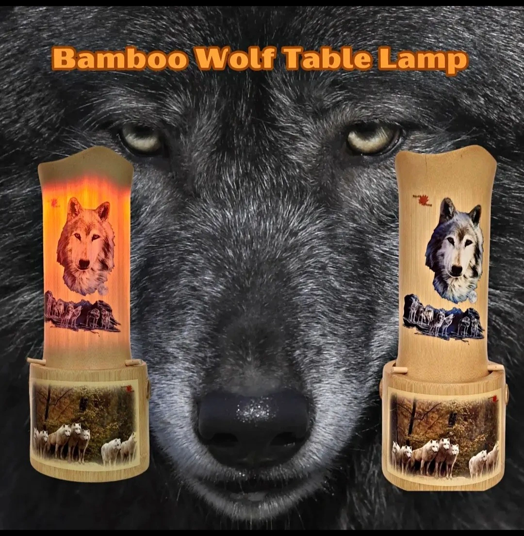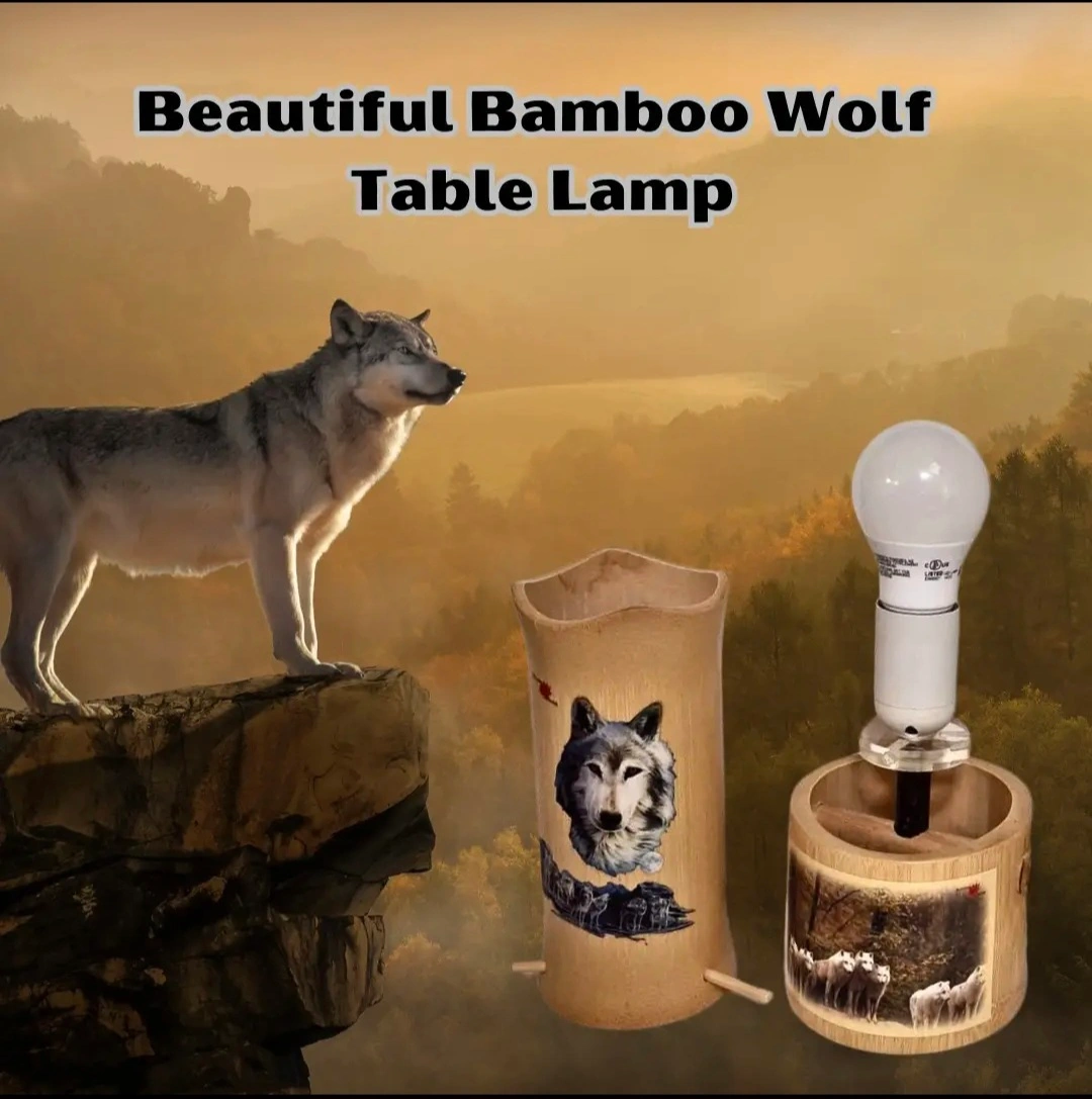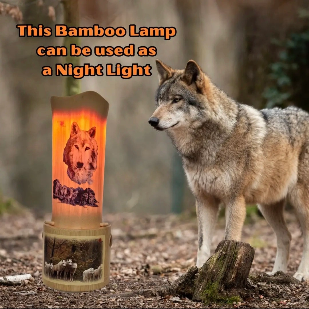 Elegant Design: Features a stunning wolf image on the shade, complemented by a beautifully crafted base adorned with artist wolf motifs. Warm Ambiance: The cylindrical bamboo cover softly diffuses light, creating a cozy a inviting atmosphere ideal for any room. Versatile Use: Perfect as a night lamp, accer piece, or unique home decor item that adds charm to your living space. Eco-Friendly Material: Made from sustainable bamboo, ensuring both durability and a natural aesthetic. Thoughtful Gift Idea: An ideal present for wolf lovers, nature enthusiasts, or anyone who appreciates unique and artistic home decor.