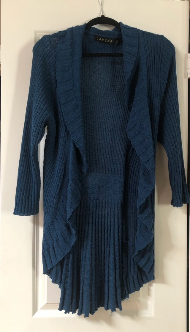 A long-sleeved, blue cardigan with a ruffled hem. It has a tie in the back. The cardigan is made of a soft, knitted fabric. It is perfect for layering over a shirt or dress. Pick up @ midtown, cash only🤗
