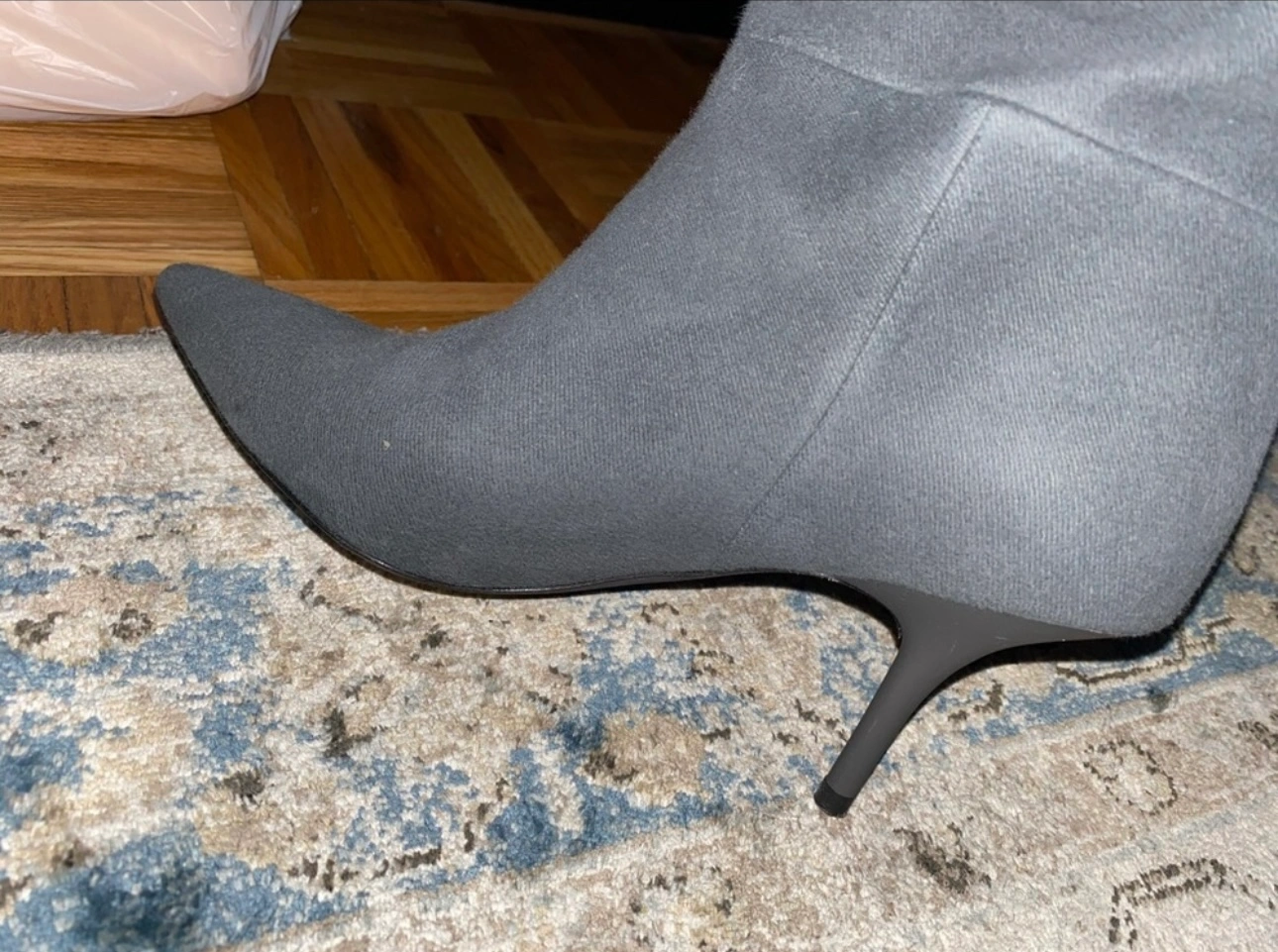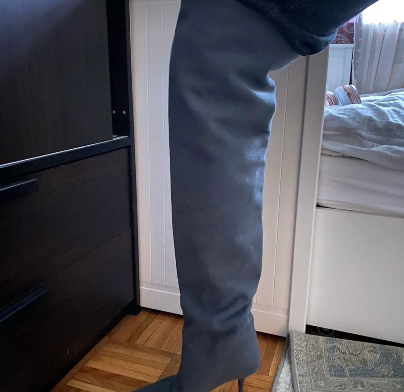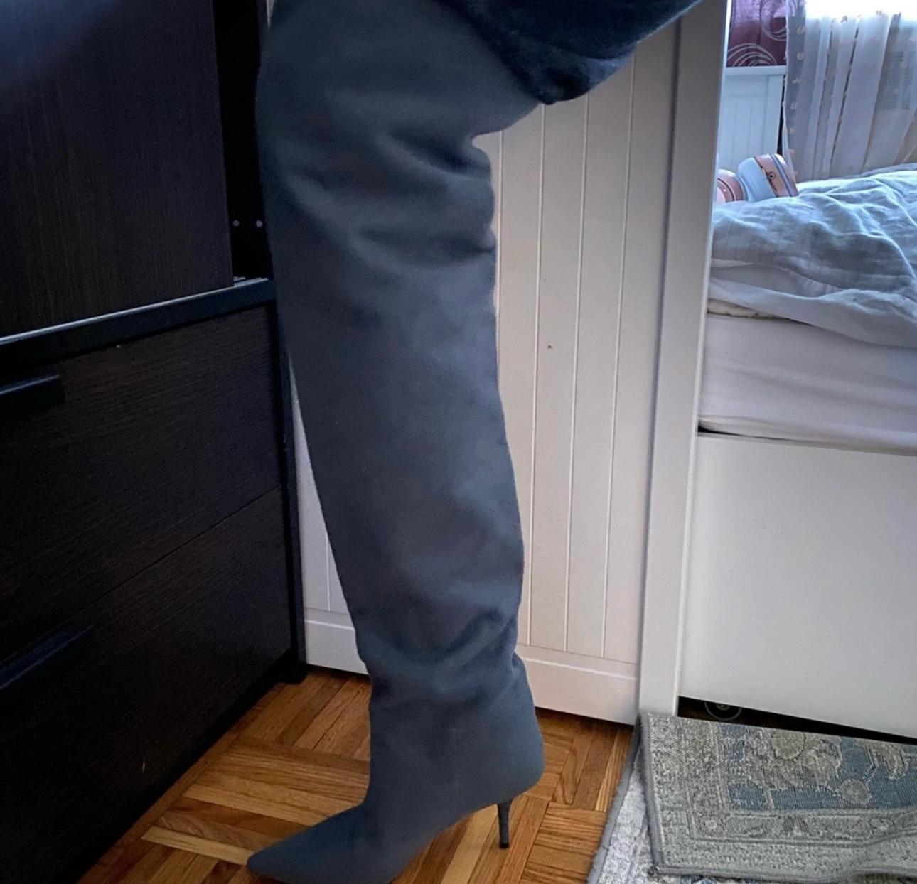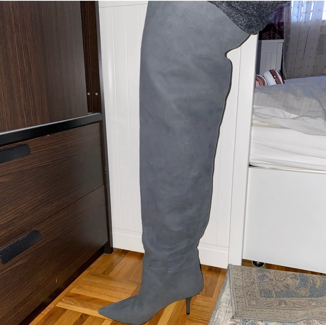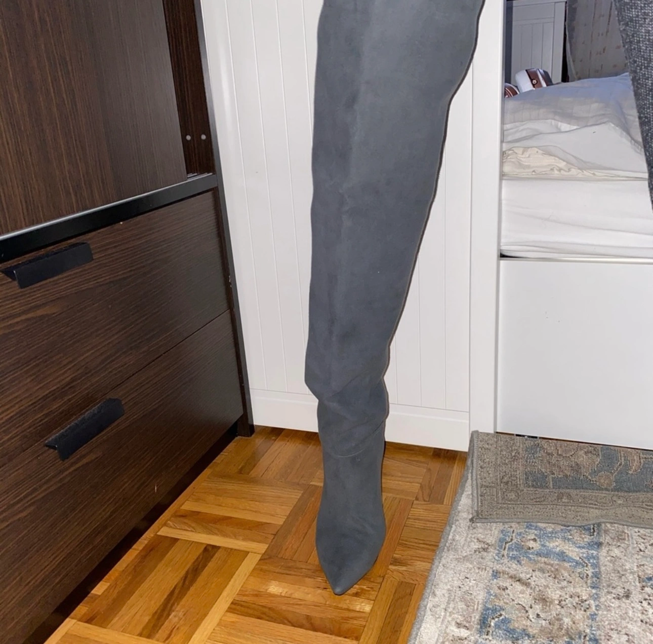 Grey suede over the knee boots with a pointed toe and stiletto heel. They are brand new
