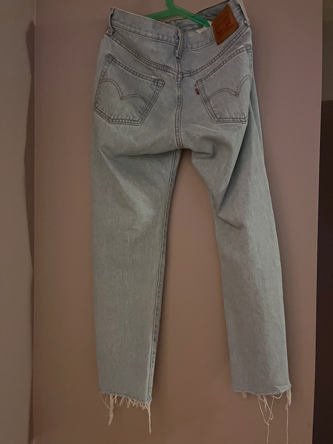 These are a pair of light blue, distressed Levi's jeans. They are a straight leg style and have a frayed hem.