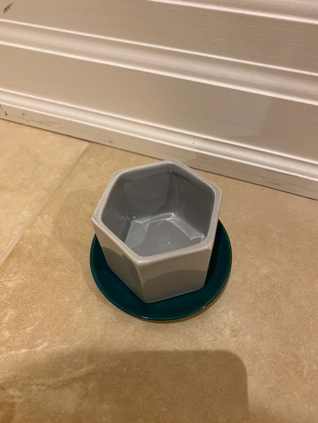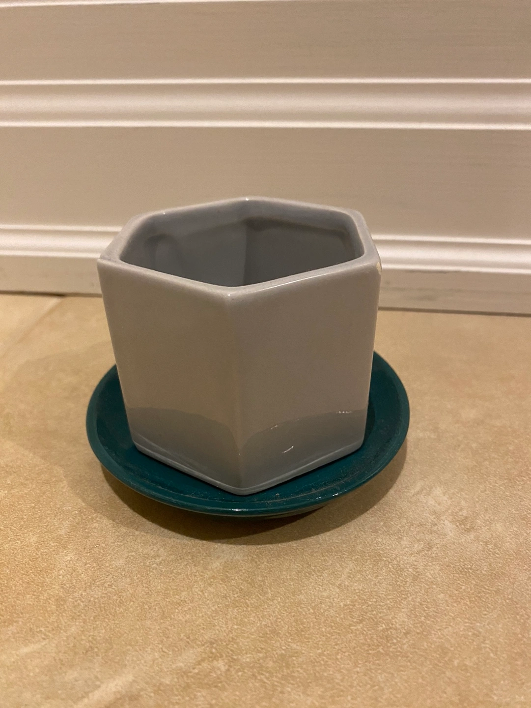 Small grey planter with a teal saucer. Perfect for a succulent or small plant.