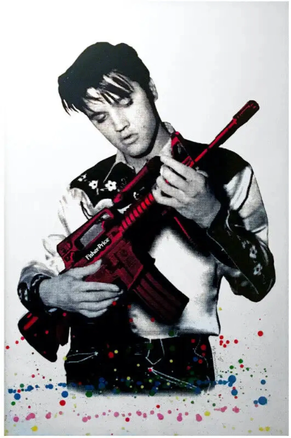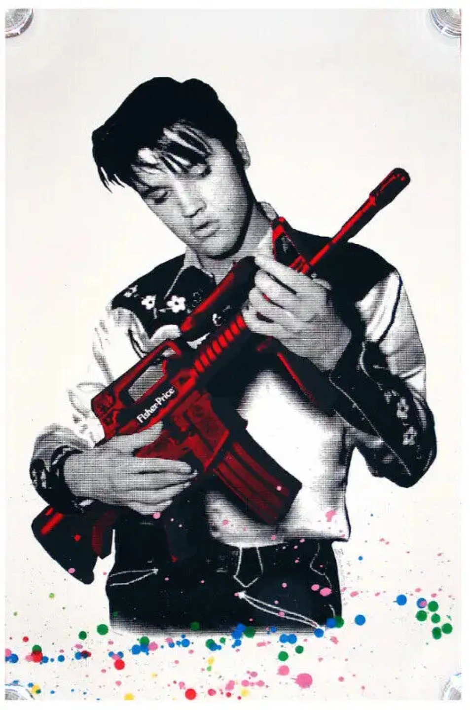Authentic Mr Brainwash artwork, signed and numbered. “Don’t Be Cruel (Red Gun Edition)” Number 164/200 Number 174/200 Screen print, hand-embellished with unique paint gun splatter, 24” x 36”, 2008, signed, framed. Received directly from the “Life Is Beautiful” exhibition where I personally met Mr Brainwash, June 18, 2008 in Los Angeles, as seen in Banksy’s Oscar-nominated “Exit Through The Gift Shop” documentary film. You can see him creating these artworks in that film. $3800 each $7000 for both Pick up at Front Street East at Church Street.