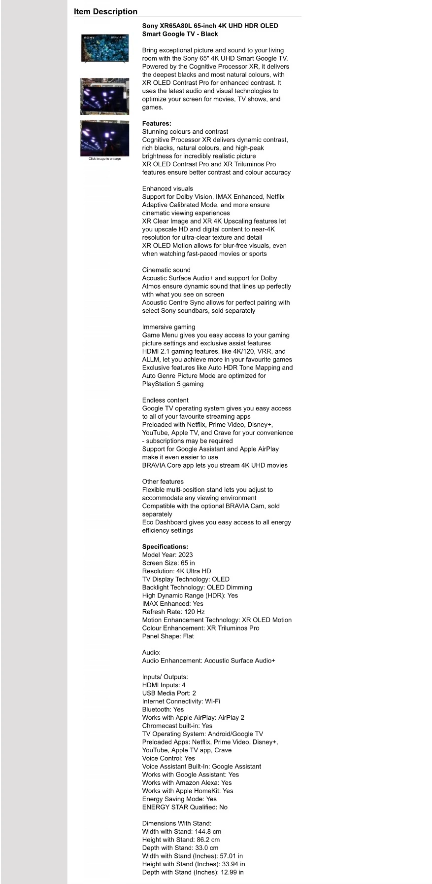 New - damaged during shipping! (Read ⬇️) MSRP $2,399.99 + tax PRICE FIRM or FIRST COME! Items Included: Sony 65” 4K UHD HDR OLED Smart Google TV (XR65A80L) Remote Power Cable Items not included: Stand Wall mount bolts Back cover plate Unit has been tested and is fully functional. Box was severely torn during shipping, accessories lost during incident. Minor bubble marks and scuffs on screen from shipping, no impact to screen, pixels or functionality. Scuffs and bubble marks are NOT visible when screen is turned on. Small 1cm pressure circle on bottom-right center of screen near bezel from shipping accident. Pixels are damaged in this area, see last image. OEM box NOT included, packaged in alternate box. Pay via Cash, Credit, e-transfer, crypto, Apple Pay, & MORE! **Delivery and Shipping is possible depending on location and small fee. Delivery and shipping fees must be paid in advance by you regardless of purchase** https://www.sony.ca/en/bravia/products/a80l-a83l-a84l-series Caveat emptor It is the duty of the buyer to inspect, test, and agree to our products prior to completing transaction. You accept full responsibility of the product the second money exchanges hands even if you choose to not test and inspect. If the unit is factory sealed and you decide to break the seal to inspect and test, you agree to complete the sale as long as the product inside is in adequate condition.