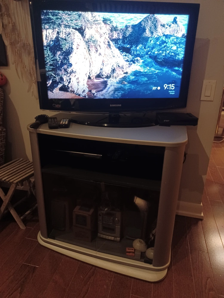The TV stand is in good condition and has two shelves. The doors are made of glass and the stand is a silver finish. It has a modern design and would be a great addition to any home. it fits my 32 inch tv (TV not included) pick up only $10 cash yonge and Sheppard