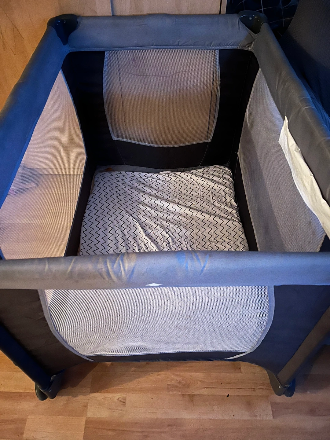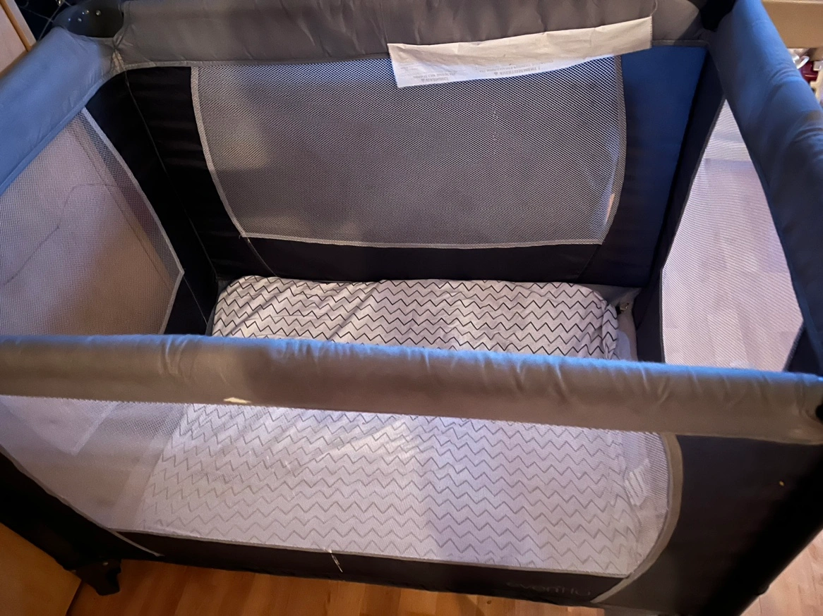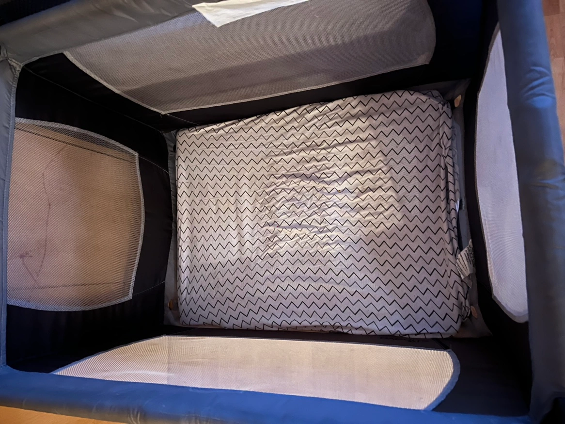 Size 100cm long x 70cm wide. In good condition. Selling for this price as we don’t have space Great for travel. Includes two fitted sheets Pet free/smoke free home