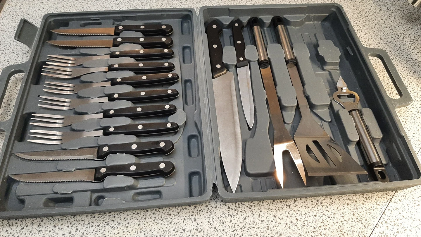 This steak set or BBQ set contains 6 knives, 6 forks can opener and cutting board in a grey case. large knife and other tools for making a good steak or for BBQ Pick up location is near Yonge and Shepperd