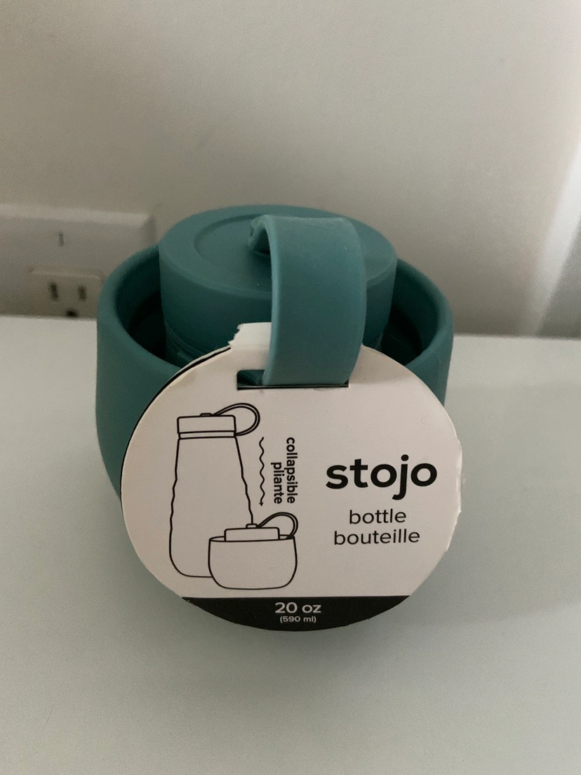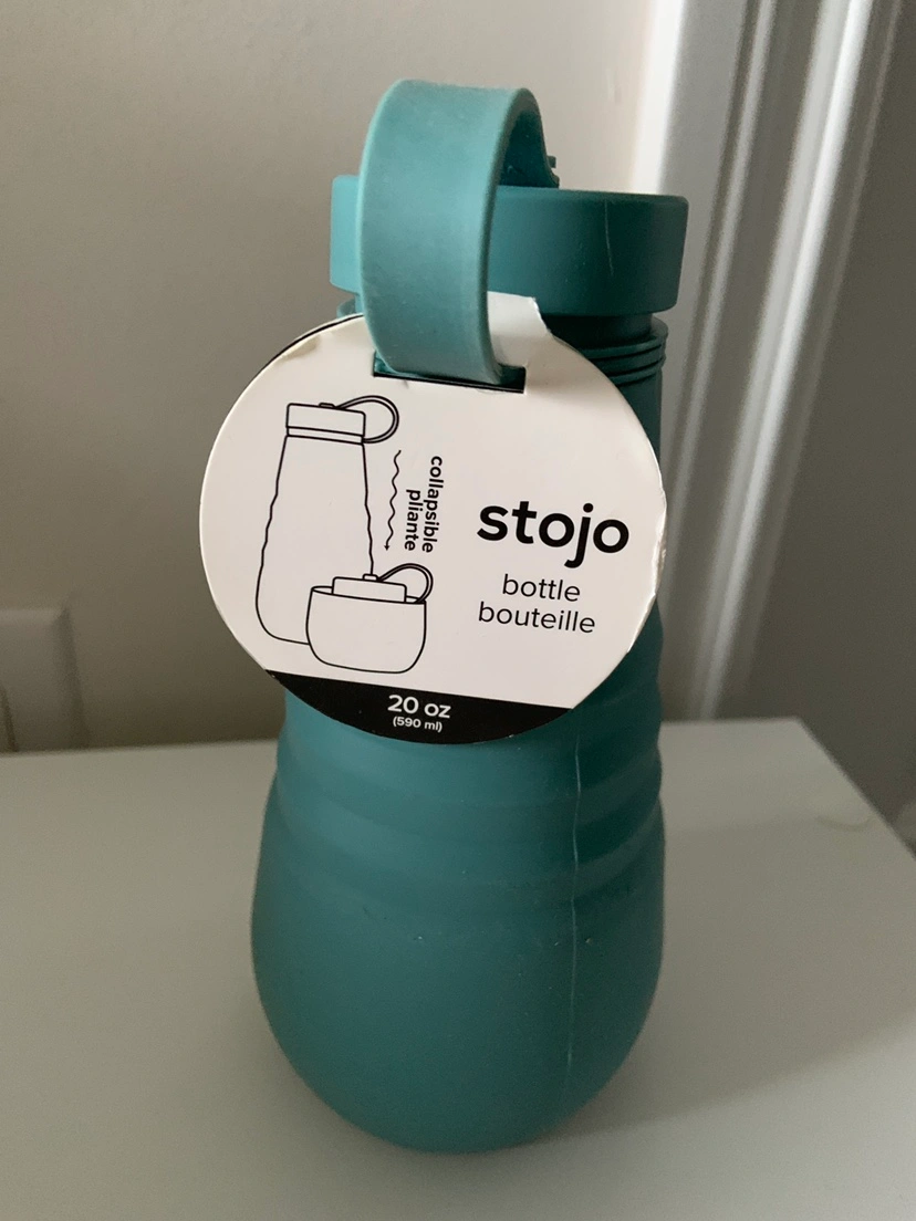 20 oz teal blue collapsible water bottle. This water bottle is great for travel or taking to the gym as it is compact and easy to store.