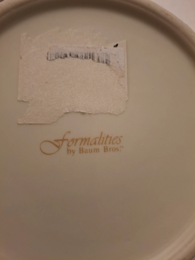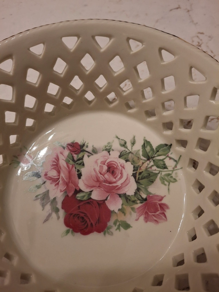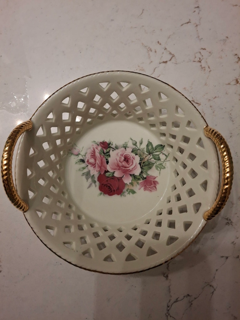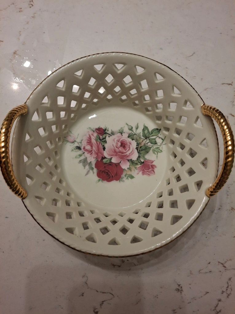 A small lattice work china basket with ridged gold trim and handles, featuring a floral design- pink & red roses with leaves. Made by Formalties by Baum Bros. Excellent condition, 6” x 6”. Available for pickup in Markland Wood.