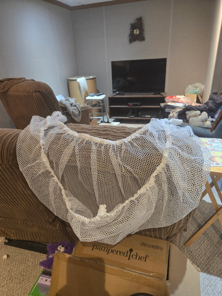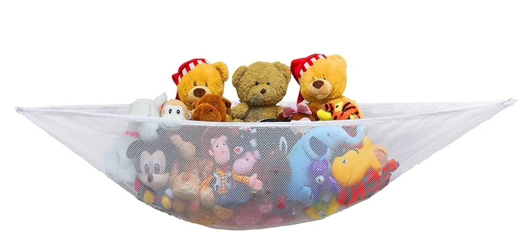 White toy hammock, great for storing stuffed toys. It can be hung from a ceiling hook or a chair. This is a great way to organize stuffed toys and keep them off the floor. It can hold a lot of stuffed animals.