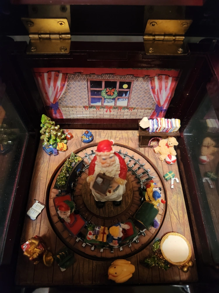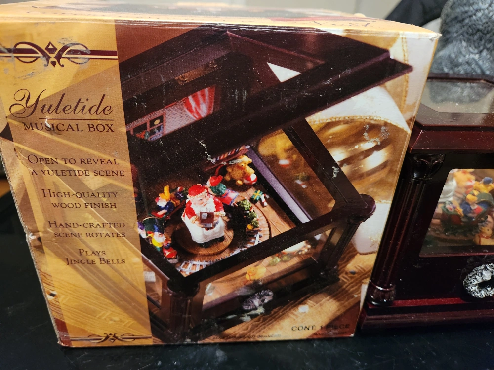 Used but in excellent condition. Plays Jingle Bells both with top open or closed. No knicks or scratches on wood or glass. Just dusty on the outside. $35. Pickup only. Cash only. This musical box features a rotating scene of Santa Claus and a toy train in a winter wonderland.