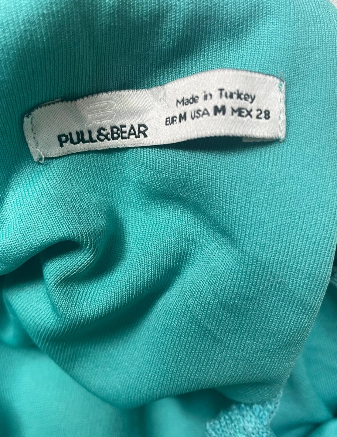 Teal halter dress by Pull & Bear, size Medium. Made of a lightweight, stretchy material. The dress is sleeveless and has a halter neckline. The fabric is openwork, but not see-through. The dress is in like new condition!