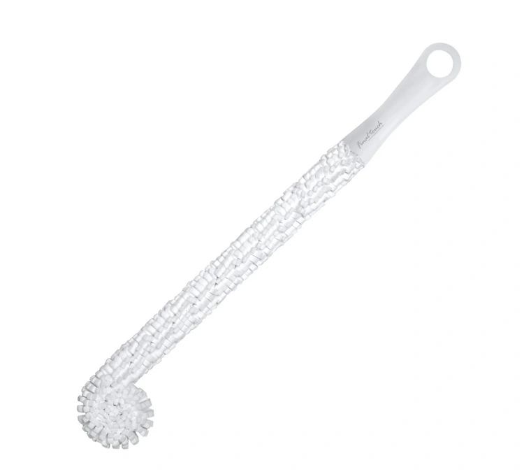A bottle cleaning brush with a long, flexible handle.