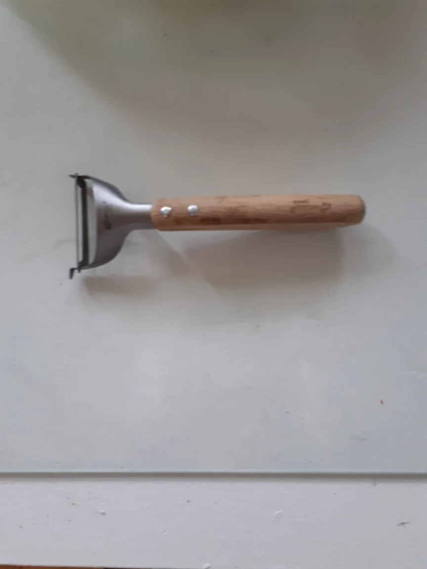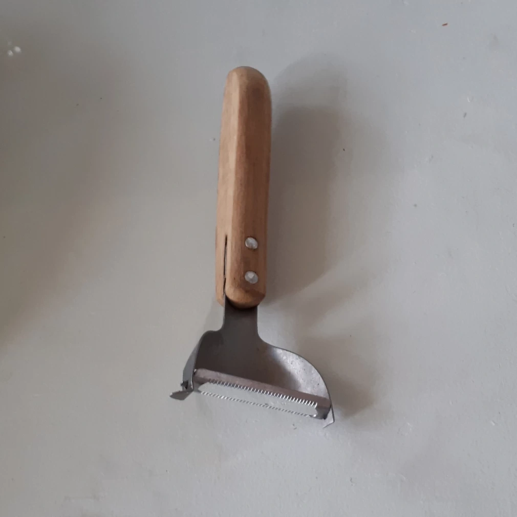 A vegetable peeler with a wooden handle. The blade is stainless steel. It is in good condition.