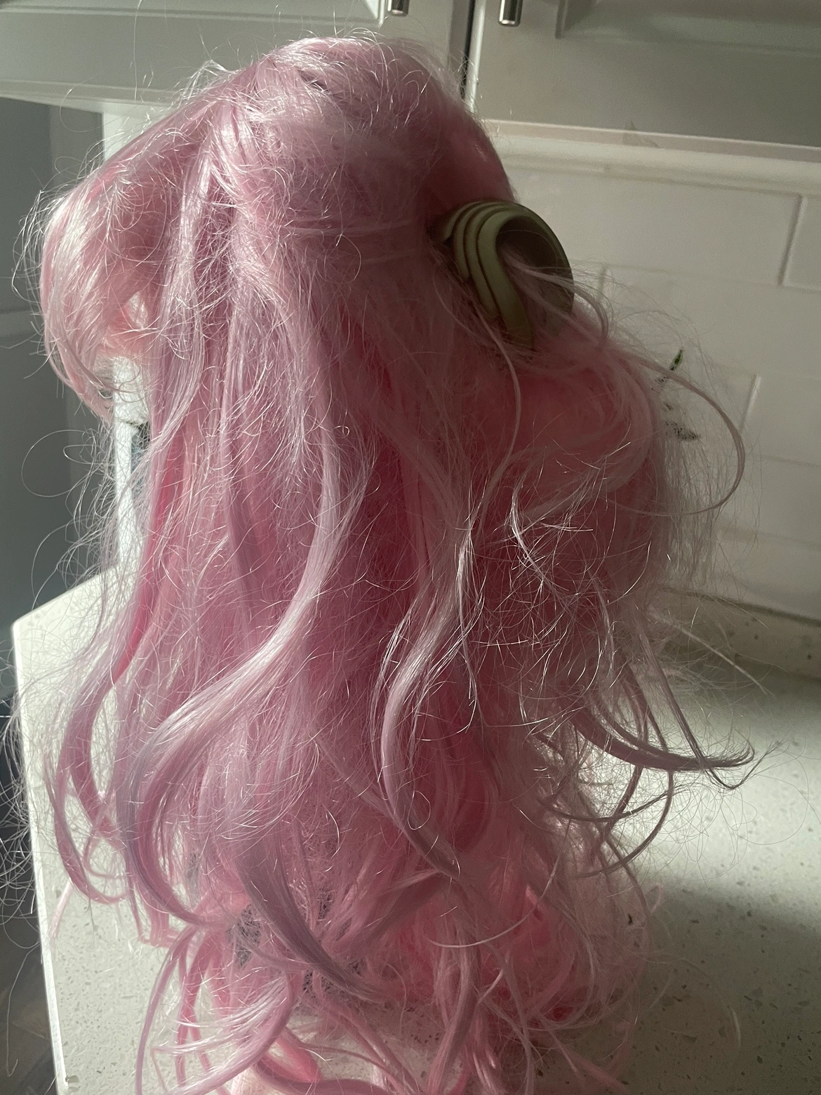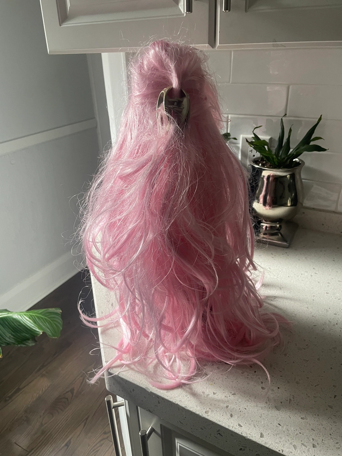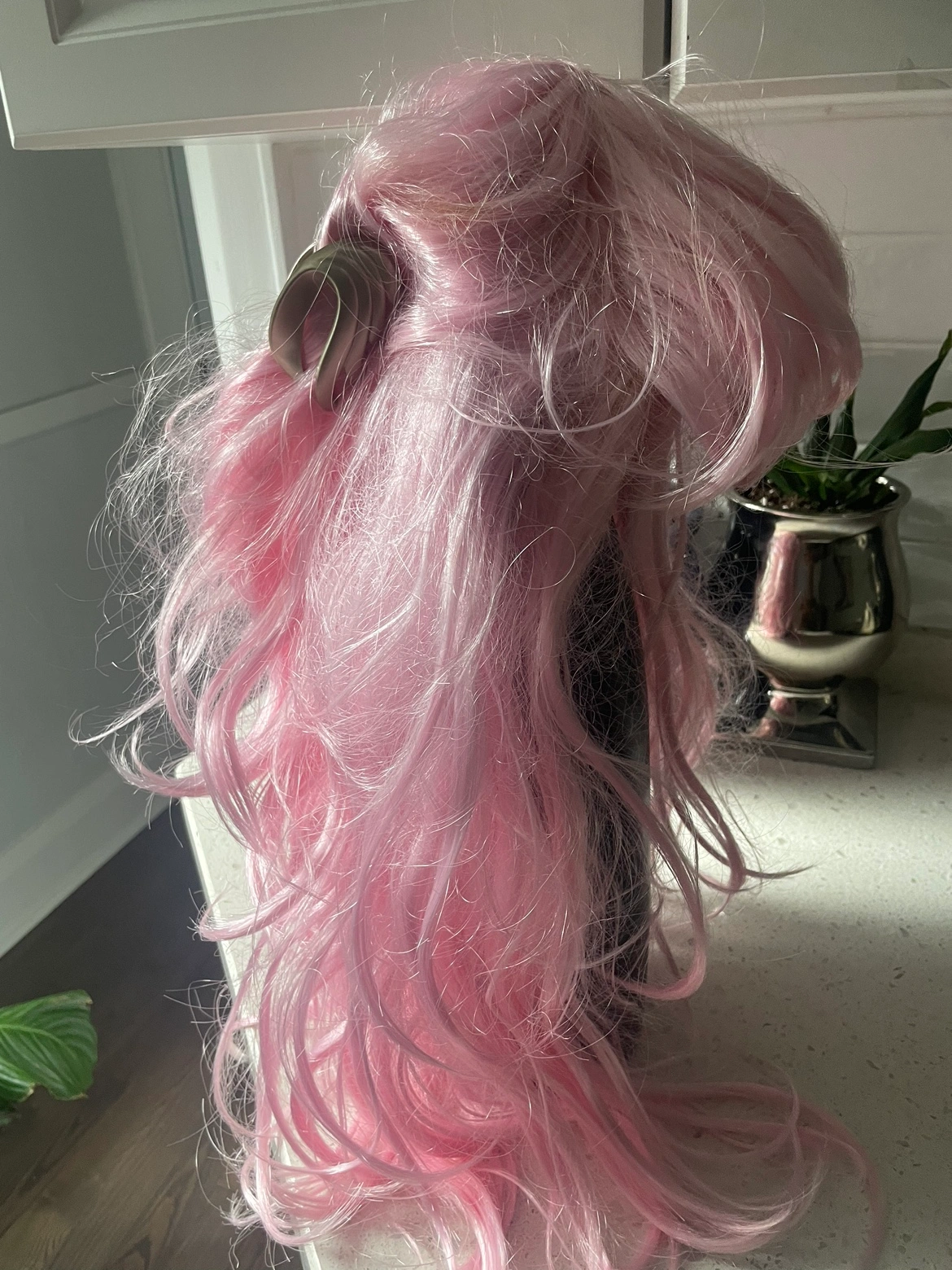 Long, wavy pink wig. It has a slight curl at the end of the strands. It is light and easy to wear. Perfect for costume parties. Worn only once for Halloween - dressed as Cotton Candy!!
