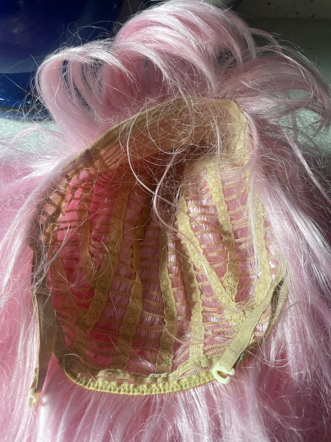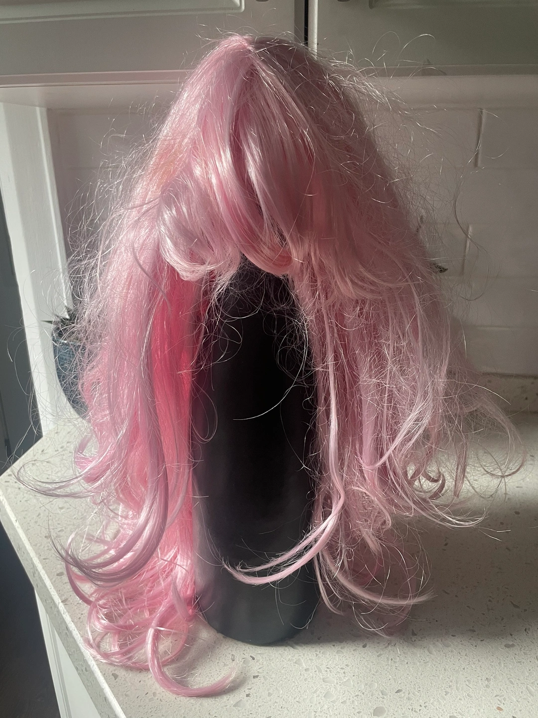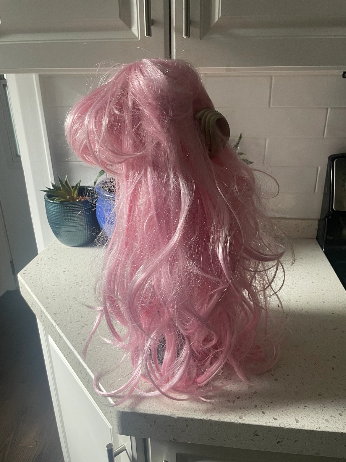 Long, wavy pink wig. It has a slight curl at the end of the strands. It is light and easy to wear. Perfect for costume parties. Worn only once for Halloween - dressed as Cotton Candy!!